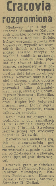 Niedawny lider II ligi — Cracovia. doznała w Katowicach wysokiej porażki 2:5 (0:2) w meczu z Rapidem. Goście, którzy wystąpili wczoraj. bez Szymczyka, wypadli we wszystkich liniach b. słabo, nie mogąc znaleźć z recepty na szybko i ambitnie grających piłkarzy śląskich. Nie popisał się również Michno w bramce, zastępujący w II po¬łowie Stroniarza. Przepuścił co dwa dość łatwe do obrony strzały. Nerwowo zagrała również i obrona, a atak dopiero w końcowych minutach przeprowadził kilka składniej- szych akcji, strzelając 2 bramki przez Hausnera i Kowalika. Prawoskrzydłowy Cracovii oraz Kupiec byli jedynymi graczami gości, którzy zagrali na dobrym poziomie, reszta całkowicie zawiodła.