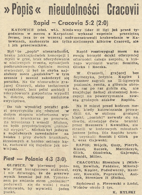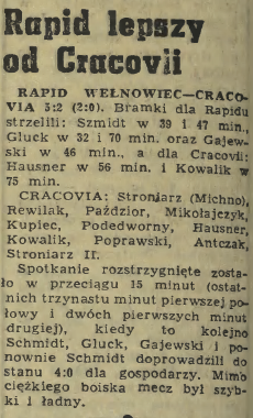 Był to „popis” niezaradności braku jakiejkolwiek koncepcji i myśli w grze, brak zdecydowania w nielicznych zresztą, sytuacjach podbramkowych. Ogólnie można stwierdzić, iż był to chyba najsłabszy mecz „pasiaków” w tym sezonie i musiał zakończyć się porażką. Na tle niezaradnie grającej Cracovii, słabo technicznie wyszkoleni, lecz pełni ambicji 1 zdecydowania gospodarze wypadli b. dobrze, odnosząc zasłużone zwycięstwo. Do tak wysokiej porażki gości przyczyniła się również w dużym stopniu niefortunna wymiana bramkarza po przerwie. Za Stroniarza i wszedł Michno, co było przysłowiowym „zamienił stryjek”… Michno był jednym z najsłabszych zawodników na boisku i przy dwóch bramkach, strzelonych z bardzo ostrego kąta, zachował się zupełnie jak nowicjusz. Rapid rozstrzygnął mecz na swoją korzyść dzięki olbrzymiej ofiarności całego zespołu, z którego wyróżnić warto: Szmidta, Glicka i Koczka. W Cracovii, grającej bez Szymczyka, jedynie Kupiec i Hausner zagrali na Ii-ligowym poziomie, reszta, a głównie obrona, raz po raz gubiła się, nie znajdując żadnej skutecznej koncepcji na powstrzymanie zawsze groźnych ataków Rapidu.