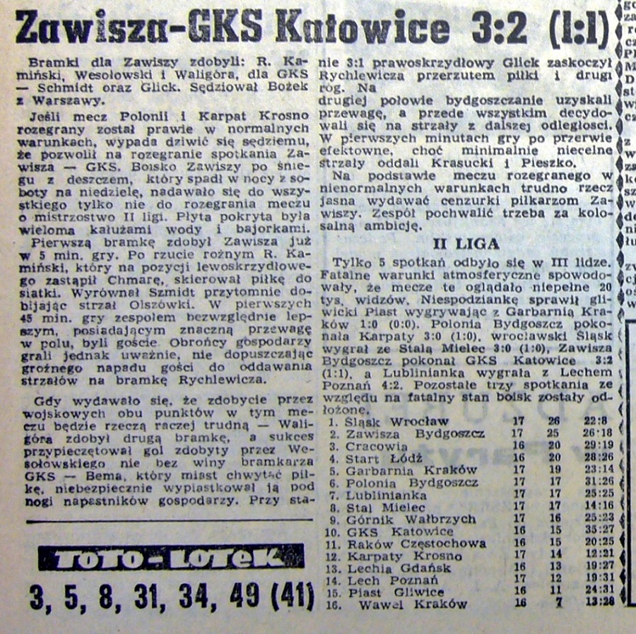 Już nie Rapid Wełnowiec, a GKS Katowice był rywalem Zawiszy w meczu rewanżowym. Drużyna z Górnego Śląska zimą (27 lutego) jako jedna z kilku połączyła się z innymi tworząc klub GKS Katowice. Kolejny mecz rundy wiosennej odbył się w fatalnych warunkach. Po nocnych opadach śniegu z deszczem boisko nie kwalifikowało się do rozegrania spotkania ligowego, jednak arbiter podjął inną decyzję. Na grzęzawisku „wojskowi” zagrali bardzo ambitnie. Zdaniem reportera „Gazety Pomorskiej” bydgoszczanie zyskali dwa punkty dzięki ofiarnej grze obrońców. Goście zwłaszcza w pierwszej połowie mieli przewagę. Prowadzenie zdobyli gospodarze w 5 minucie. Piłkę po rzucie rożnym przejął lewoskrzydłowy Ryszard Kamiński i bez problemów trafił do siatki. Katowiczanie wyrównali w 31 minucie. Strzał łącznika Strzelczyka obronił Rychlewicz, lecz odbitą piłkę przejął Schmidt i nie dał szans golkiperowi Zawiszy. Bydgoszczanie usiłowali kontrować, ale nic z tego nie wychodziło. Ich podania były niskie i krótkie, więc nie mogły przynieść korzyści, piłka po prostu zatrzymywała się w błocie. Zapewne w przerwie trener Brzozowski zwrócił uwagę na te mankamenty, ponieważ po zmianie stron „wojskowi” stosowali długie przerzuty piłki. W 67 minucie na strzał zdecydował się Pieszko. Piłka odbiła się od słupka, w zamieszaniu przejął ją Waligóra i między nogami bramkarza posłał do siatki. Przy wyniku 2:1 Zawisza atakował nadal i 10 minut później zdobył trzeciego gola. Po podaniu Waligóry z rzutu wolnego bramkę zdobył Wesołowski. Wynik meczu został ustalony w 80 minucie. Zawodnik Katowic Glück przerzucił piłkę nad wybiegającym z bramki Rychlewiczem. „Przegląd Sportowy” już w tytule relacji zaznaczył: „GKS bliski remisu z Zawiszą”. W tej kolejce II ligi ze względu na zły stan boisk rozegrano zaledwie 5 spotkań. Przodownik tabeli Śląsk Wrocław wygrał 3:1 ze Stalą Mielec