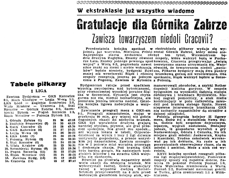 Pierwszy mecz trenera Bronisława Waligóry. Ostatni mecz w barwach Zawiszy Jana Pieszki. Dla „wojskowych” to był mecz, który w przypadku wygranej prolongował jeszcze szansę utrzymania się w lidze. Mając świadomość stawki spotkania bydgoszczanie grali ambitnie i atakowali. Już do przerwy powinni prowadzić przynajmniej 2:0, bo obrońcy gości spisywali się słabo. Nawrocki, Unton, Pieszko i Kostrzewiński okazali się jednak nieskuteczni. GKS również przeprowadzał groźne akcje, szczególnie za sprawą dwójki Schmidt – Rother. W 14 minucie Rychlewicz obronił strzał głową drugiego z wymienionych, a kilka minut później bydgoski bramkarz nie dał się pokonać po uderzeniu Olszy. Do kuriozalnej sytuacji doszło w 20 minucie. Armknecht został dosłownie znokautowany przez kolegę z drużyny – Nawrockiego. Stało się to po silnym strzale pomocnika Zawiszy, po którym piłka „raziła” Armknechta. W jego miejsce wszedł do gry w drugiej połowie, Kaczmarek. W 67 minucie Rother trafił w słupek. W 84 minucie goście zdobyli zwycięskiego gola. Po podaniu Schmidta, strzałem w długi róg do siatki trafił Rother. Po tej porażce „wojskowi” stracili szanse pozostania w lidze. Do takiej sytuacji doszło dlatego, że ich sąsiedzi z tabeli: Śląsk Wrocław i Pogoń Szczecin wygrali swoje mecze. Jak się okaże, na kolejne występy w najwyższej klasie rozgrywkowej przyjdzie czekać Zawiszy 10 lat.