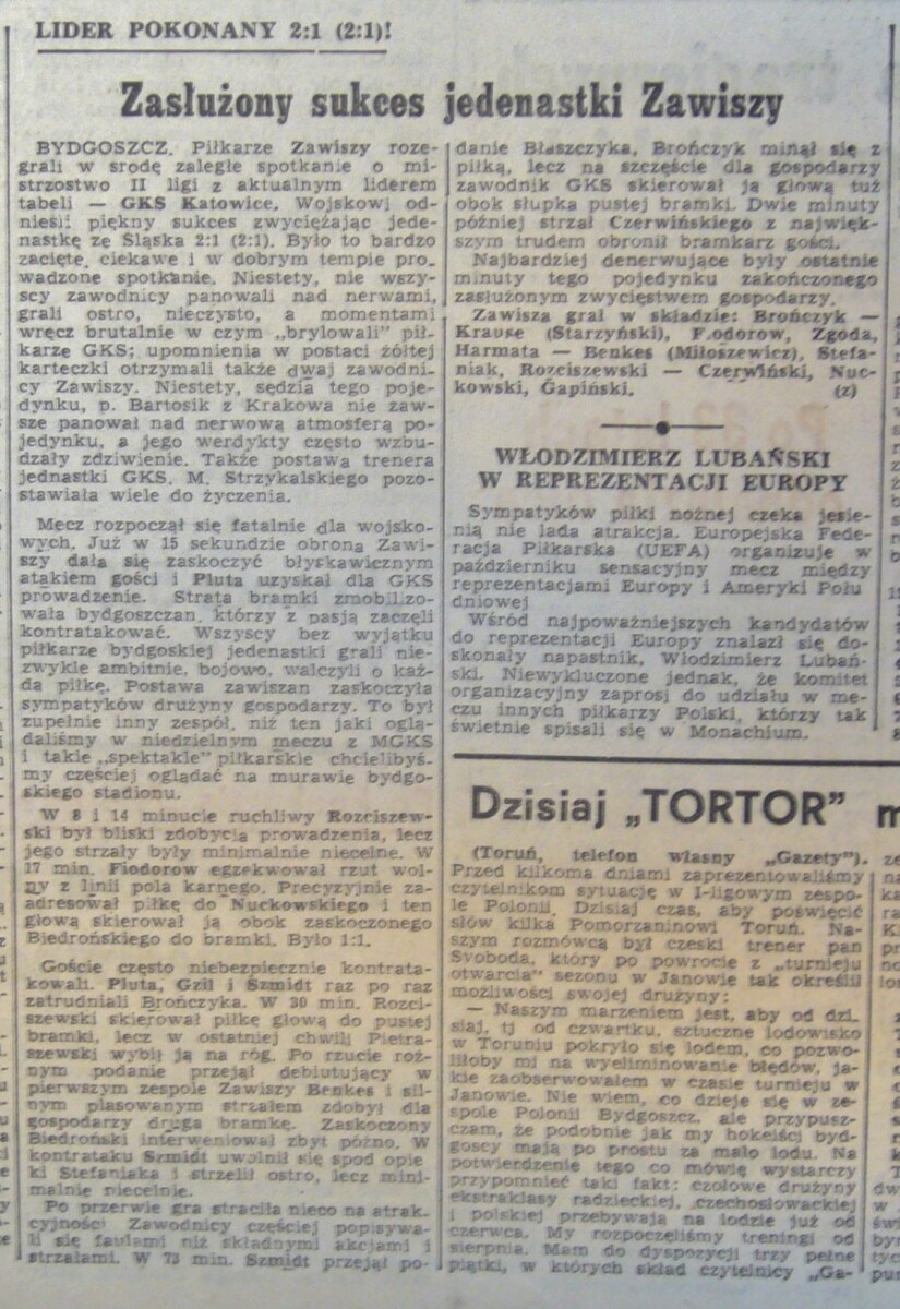 Debiut w Zawiszy: Zbigniew Benkes. W tym meczu pokonany został lider tabeli! „To był zupełnie inny zespół, niż ten jaki oglądaliśmy w niedzielnym meczu z MGKS i takie „spektakle” piłkarskie chcielibyśmy częściej oglądać na murawie bydgoskiego stadionu” – napisał sprawozdawca „Gazety Pomorskiej” o drużynie Zawiszy. Do dobrego poziomu piłkarskiego nie dostroił się sędzia z Krakowa. Jego wiele decyzji było błędnych, czym tylko zaostrzył i tak nerwową już atmosferę. Zawodnicy byli karani żółtymi kartkami. Zostało upomnianych dwóch piłkarzy Zawiszy, lecz ich nazwisk nie wymieniono. Prowadzenie zdobyli katowiczanie, gdy po szybkiej akcji, Brończyka pokonał Pluta. Działo się to w 15 sekundzie spotkania. Kiedy spodziewano się „czarnego scenariusza”, okazało się, że stracony gol zmobilizował bydgoszczan, którzy walczyli ofiarnie i udanie atakowali. W 8 i 14 minucie na bramkę minimalnie niecelnie strzelał Rościszewski. W 17 minucie padło jednak wyrównanie. Z linii szesnastu metrów rzut wolny wykonywał Fiodorow. Dośrodkowana przez niego piłka trafiła na głowę Nuckowskiego, który zaskoczył bramkarza gości – Biedrońskiego. W 30 minucie głową strzelał Rościszewski. Katowiczan uratował Pietraszewski, wybijając piłkę z linii bramkowej. W konsekwencji tego zagrania Zawisza egzekwował rzut rożny, po którym, debiutant Benkes plasowanym strzałem podwyższył wynik na 2:1. Goście w pierwszej połowie kontratakowali i Brończyk musiał interweniować, po uderzeniach Pluty, Gzila i Schmidta. Po zmianie stron gra była mniej atrakcyjna. Kibice oglądali dużo ostrych zagrań, w czym celowali zwłaszcza przyjezdni. W 73 minucie GKS mógł wyrównać, kiedy po podaniu Błaszczyka, niecelnie głową uderzał Schmidt. Sytuacja ta miała miejsce, gdy Brończyk minął się z piłką. 120 sekund później Biedroński obronił ładny strzał Czerwińskiego.