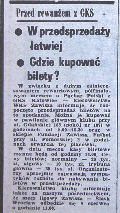„Nadwiślański Przegląd Sportowy. Stadiony” z 03.06.1991 o biletach na mecz pucharowy Zawisza – GKS Katowice (05.06.1991).