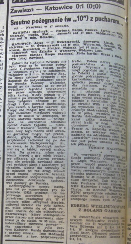 „Gazeta Pomorska” z 06.06.1991 o meczu Pucharu Polski Zawisza – GKS Katowice (05.06.1991)