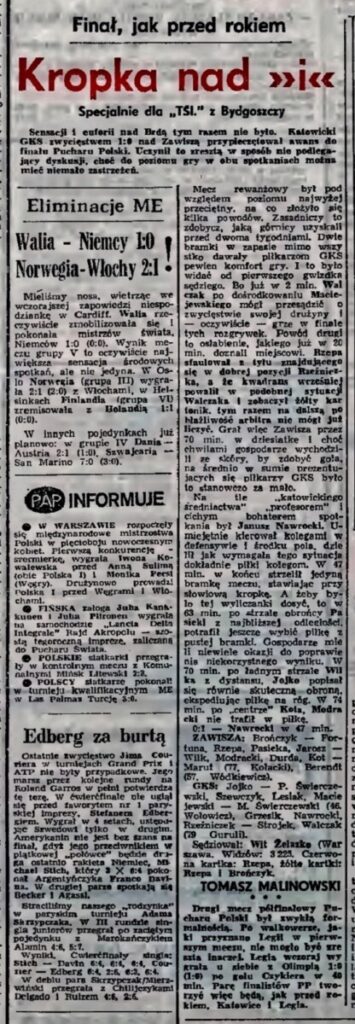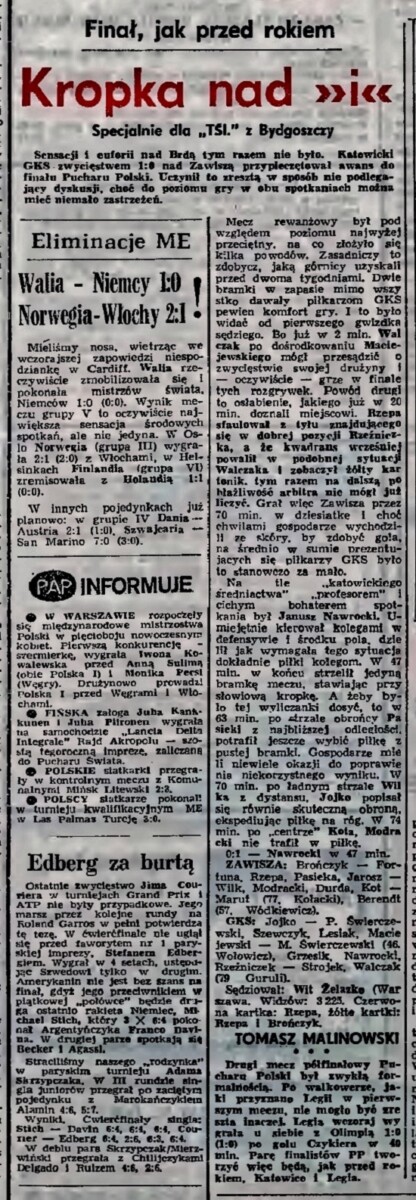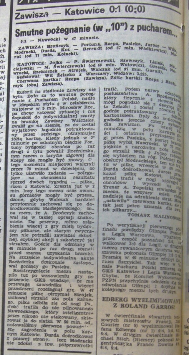 Relację dla „Trybuny Śląskiej” z 06.06.1991 o meczu Zawisza – GKS Katowice (05.06.1991) napisał dziennikarz „Gazety Pomorskiej” Tomasz Malinowski.
