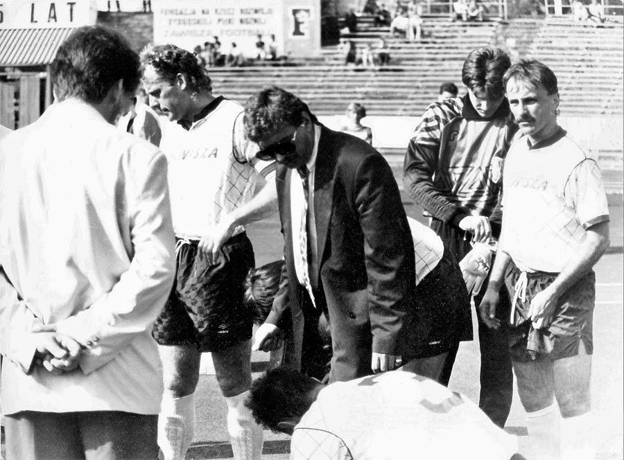Zawisza – GKS Katowice 2:3 (20.06.1992). Z prawej Janusz Czyrek, a obok niego bramkarz Robert Matuszewski. W okularach trener Adam Topolski, a z jego lewej strony Dariusz Pasieka. Z lewej strony (tyłem) asystent trenera Topolskiego, Bernard Szmyt.