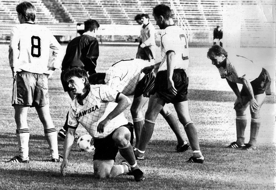 Zawisza – GKS Katowice 2:3 (20.06.1992). Drużyna Zawiszy w czarnych spodenkach. W wyskoku o piłkę walczy Dariusz Pasieka (numer 5). W środku Janusz Czyrek, a z prawej strony Jerzy Łapczyński. Akcji przygląda się bramkarz Janusz Jojko (nr 1 na spodenkach).