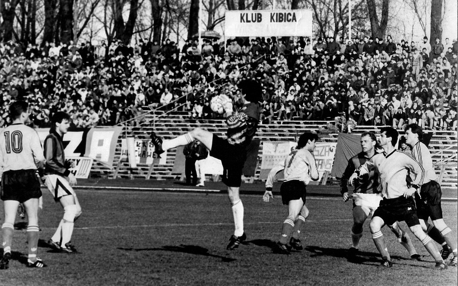Zawisza – GKS Katowice 1:0 (27.03.1993). Zawodnicy Zawiszy w koszulkach w pasy. Z lewej Dariusz Pasieka, a obok niego Krzysztof Arndt. Pierwszy z lewej na boisku leży bramkarz Janusz Jojko.