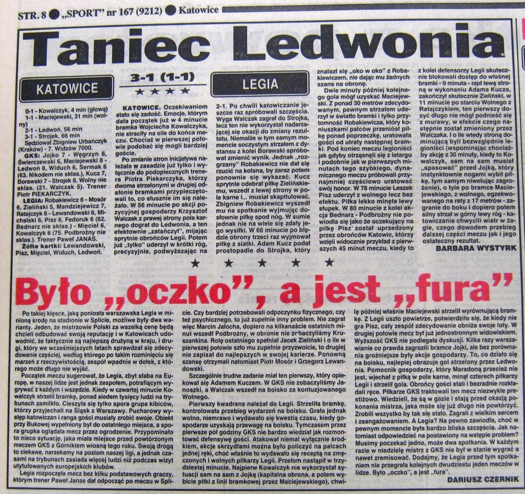 Pierwszy kwadrans należał do Legii. Strzeliła bramkę, kontrolowała przebieg wydarzeń na boisku. Grała jednak wolno, niemrawo i wydawało się kwestią czasu, kiedy gospodarze uzyskają przewagę na boisku. Tymczasem przez pierwsze pół godziny GKS nie bardzo wiedział jak rozmontować defensywę gości. Atakował niemal wyłącznie środkiem, akcje skrzydłami można było policzyć na palcach jednej ręki, choć właśnie to wydawało się receptą na zmęczonych i wolnych piłkarzy Legii. Przełom nastąpił w trzydziestej minucie. Najpierw Kowalczyk nie wykorzystał sytuacji sam na sam z Jojką (kapitalna obrona, a potem wybicie piłki z linii bramkowej przez Maciejewskiego), chwilę później właśnie Maciejewski strzelił wyrównującą bramkę. Z Legii uszło powietrze, potwierdziło się, że kiedy nie gra Piz, cały zespół zdecydowanie obniża swoje loty. W drugiej połowie mecz byl już jednostronnym widowiskiem. Wyższośc GKS nie podlegała dyskusji. Kilka razy warszawianie co prawda zagrozili bramce Jojki, ale bez porównania groźniejsze były akcje gospodarzy. TO, co działo się naboisku, najlepiej obrazuje gol strzelony przez Ledwonia. Pomocnik gospodarzym, który Maradoną przecież nie jest, wjechał z piłką w pole karne, minął czterech piłkarzy Legii i strzelił gola. Obrońcy gości stali i bezradnie rozkładali ręce. Piłkarze GKS traktowali ten mecz niezwykle prestiżowo. Wiedzieli, zę są w gazie i stają przed okazją pokonania mistrza, jaka może się już długo nie powtórzyć. Zrobili wszystko by tak się stało. Zagrali z wielkim sercem i zaangażowaniem. A Legia? Na pewno zawiodła, choć w pewym momencie była bardzo bliska szczęścia. Jak natomiast odpowiedzieć na postawiony na wstępie problem? Musimy poczekać jedno, może dwa spotkania. W każdym razie w niedzielę mistrz z GKS nie był w stanie wygrać a nawet zremisować. Dodajmy, że Legia przed tym spotkaniem nie przegrała kolejnych dwudziestu jeden meczów w lidze. Było „oczko”, a jest „fura”.
