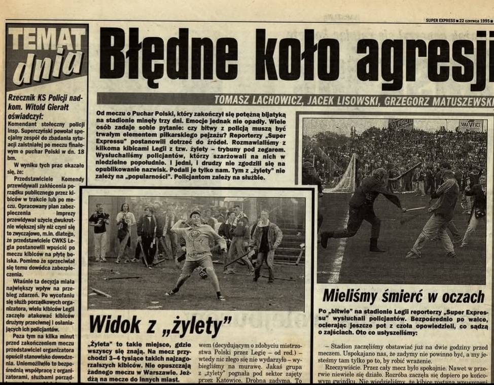 Krótka „prasówka” pomeczowa: „Najbliższy mecz stołeczna Legia rozegra bez udziału publiczności. Po rozegranym w środę pucharowym spotkaniu z GKS Katowice, na stadionie i w mieście policja zatrzymała 31 chuliganów. Do kolegium wykroczeń trafiły 22 wnioski, siedmiu młodzieńców ukarano mandatami, dwóch pojechało do izby wytrzeźwień, dowiedzieliśmy się wczoraj w Komendzie Stołecznej Policji. Straty Zarządu Transportu Miejskiego zdemolowanych autobusów szacowane są na około 100 milionów złotych (oczywiście starych złotych).