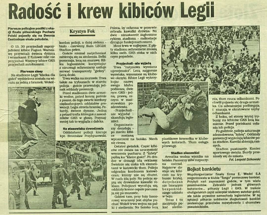 Na finałowy mecz do Warszawy przybyła około 450 osobowa ekipa „hanysów” z Katowic. Jak na GKS to chyba całkiem nieźle. Ilość nie znaczy jednak zawsze jakość. Katowice zaprezentowały się bardzo kiepsko. Najpierw podczas meczu stracili z płotu pięć flag, a później, gdy legioniści walczyli z policją, oni krzyczeli: J…ć Legie. Awantura z policją rozpoczęła się po końcowym gwizdku sędziego i ataku Legii na sektor przyjezdnych. W tym momencie do akcji włączyły się psiarskie, które stały się jednocześnie głównym celem ataków Legii. Bitwa z nimi rozpoczęła się na kopy i pięści. Później w ruch poszły sztachety, kawałki reklam oraz krzesełka. Sytuacja psów w tym momencie była na tyle poważna, iż musieli oni posłać do boju konie. Zwierzęta od razu się spłoszyły i nie było z nich żadnego pożytku. My zaś non-stop walczyliśmy. Policja z braku sprzętu musiała zasłaniać się krzesełkami. Co bardziej rozwścieczeni policjanci rzucali w nas dechami, co tylko zaostrzało atmosferę. Na polu bitwy pojawiły się nagle dwie armatki wodne. Podziałały one na tyle skutecznie, że po długotrwałej gonitwie za kibicami udało się policji oczyścić płytę. Wyskakiwały do nich przez otwarte furtki grupki harcowników Legii i przeganiały policję spod trybun, po czym cofały się spowrotem na trybuny, a policja znowu pod nie podchodziła. Taka sytuacja trwała około pół godziny. W sumie bitwa była na korzyść kibiców. Policja poniosła totalną klęskę, co odnotowały agencje masowego przekazu. O randze tej bijatyki świadczy też fakt, iż zajścia po finale PP pokazały w Europie różne stacje telewizyjne. Nawet w USA, gdzie nie popularyzuje się w telewizji przedstawiania podobnych zajść, była pietnasto sekundowa relacja.
