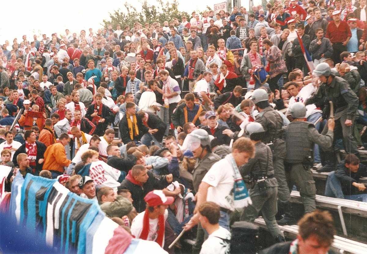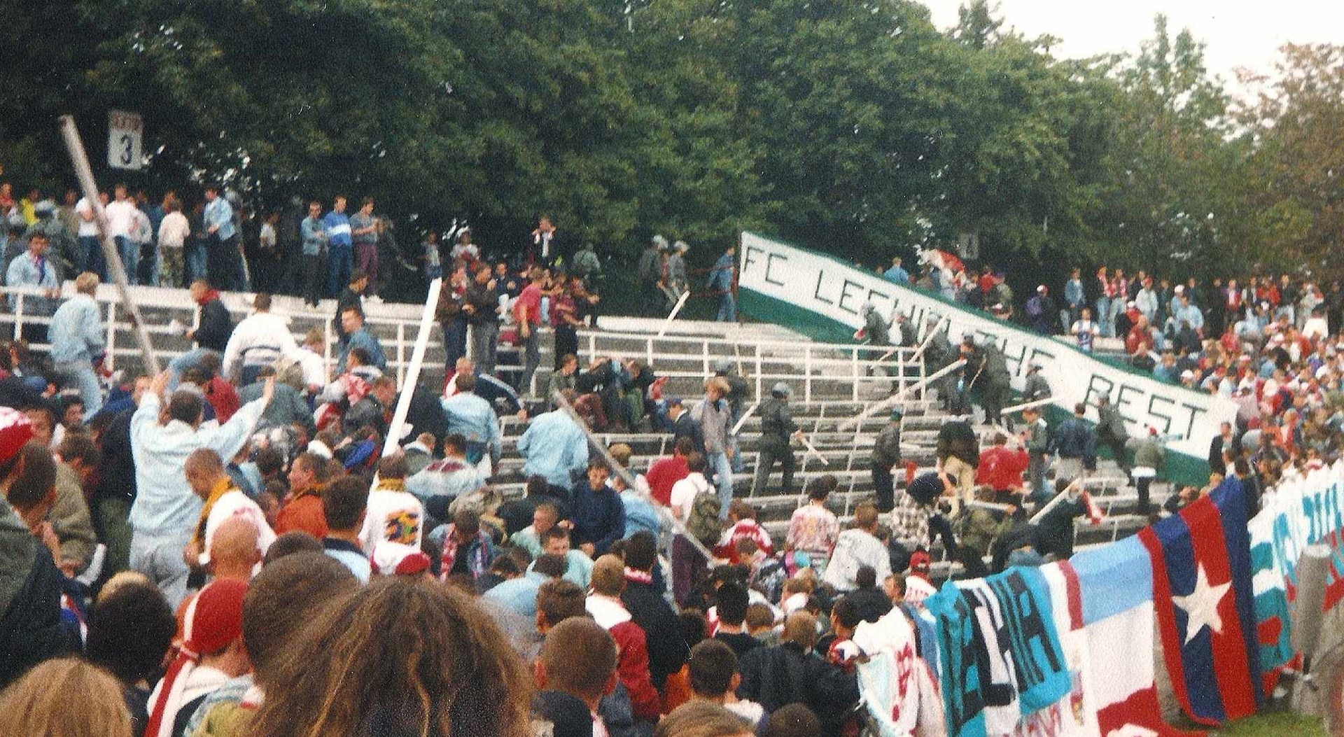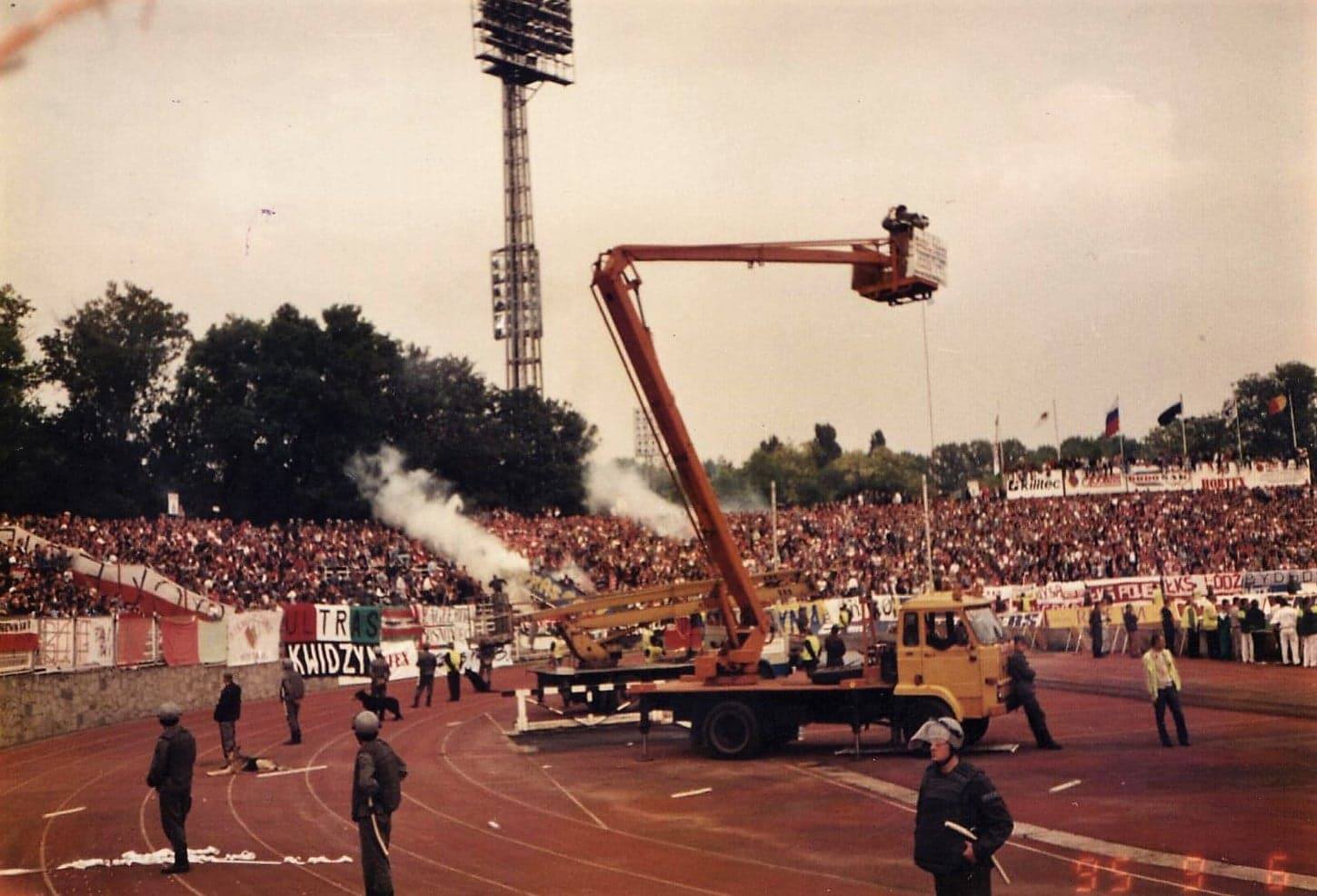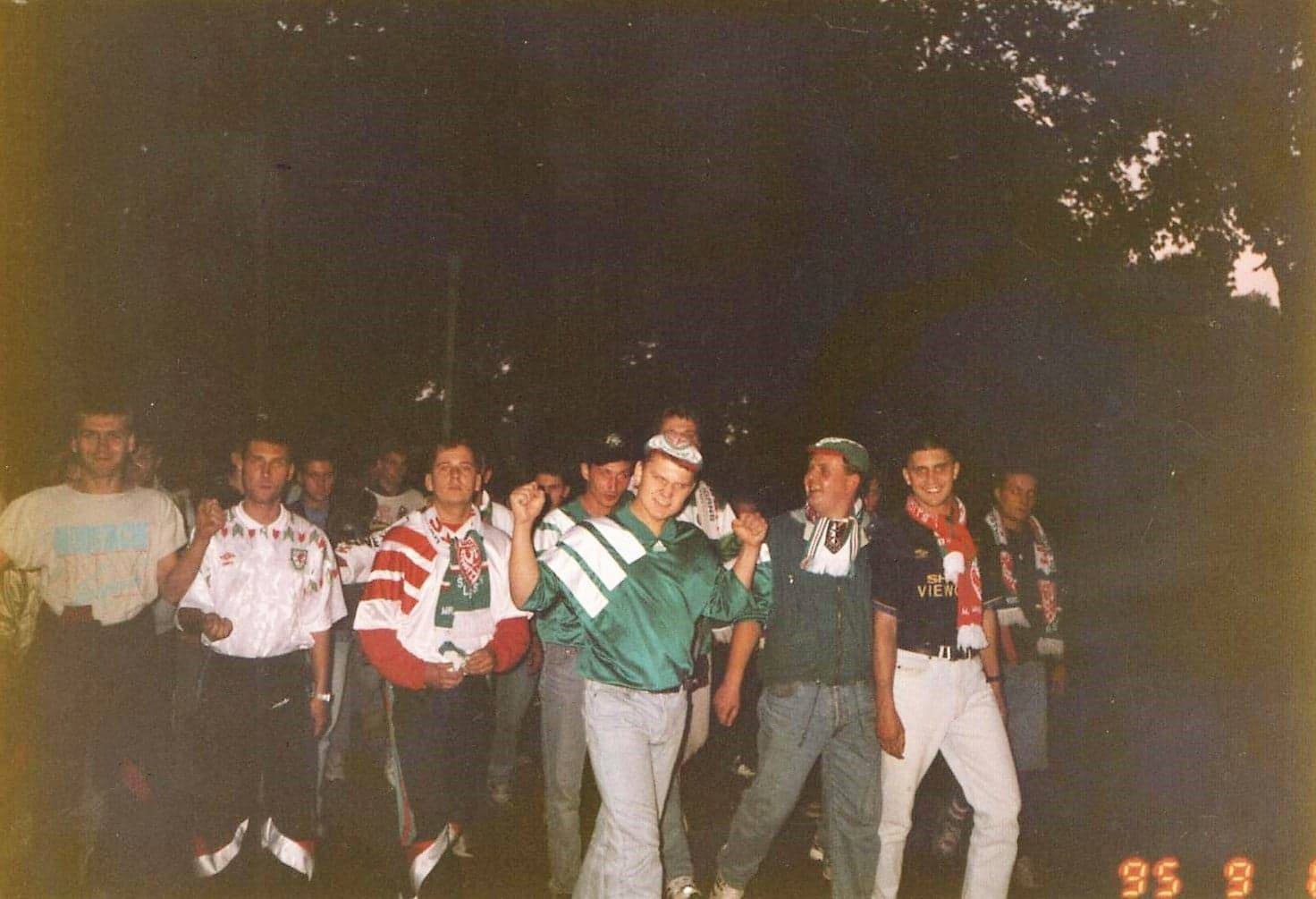 Przyjrzyjmy się jednemu z ciekawych meczów z lat 90-tych. Polska vs Rumunia, kwalifikacje do Euro 1996 w Anglii. Wielkie marzenie większości fanów piłki nożnej, aby dotrzeć do turnieju w Anglii. Wielu polskich kibiców widziało w tym czasie chusty z popularnych angielskich klubów.
