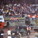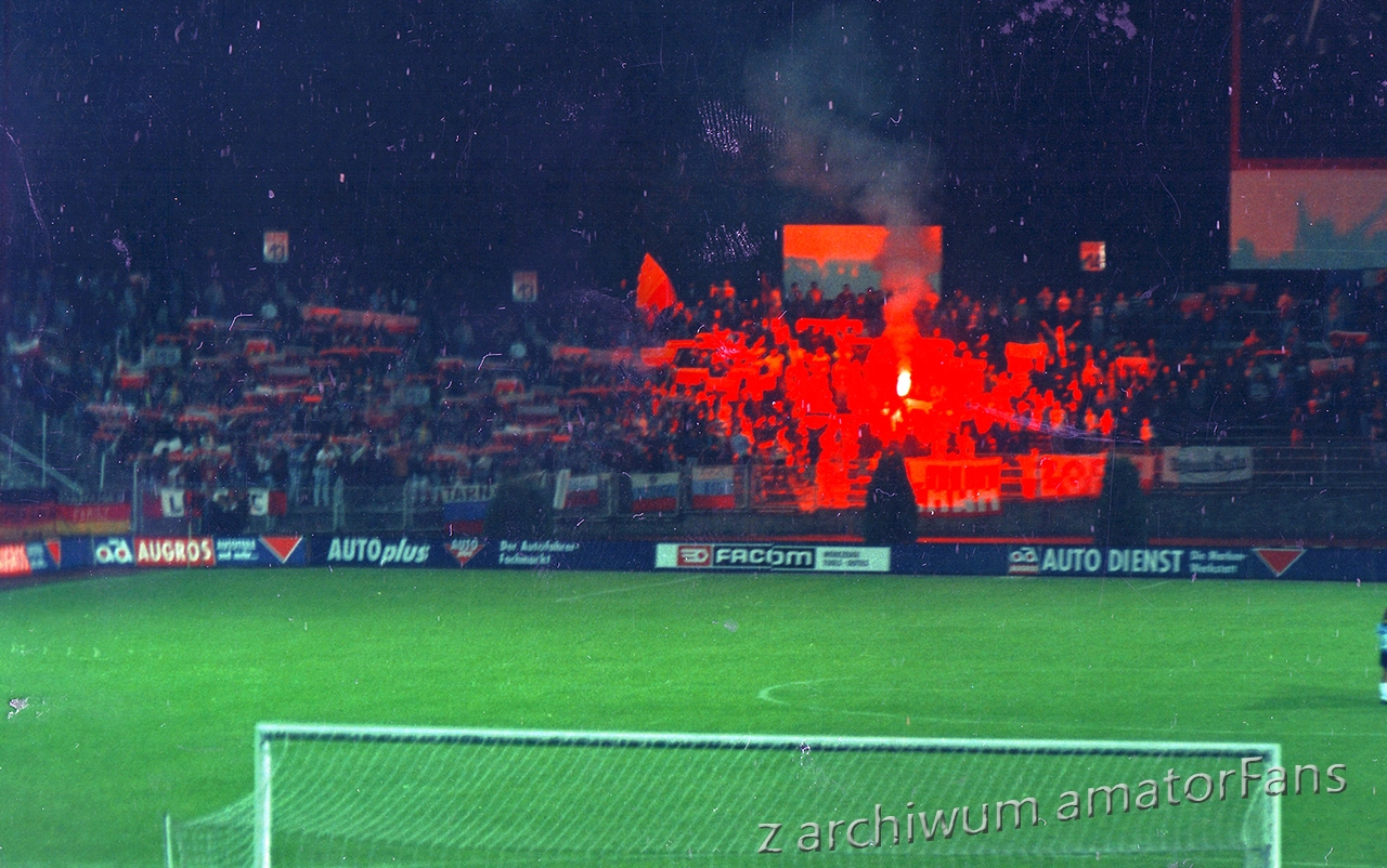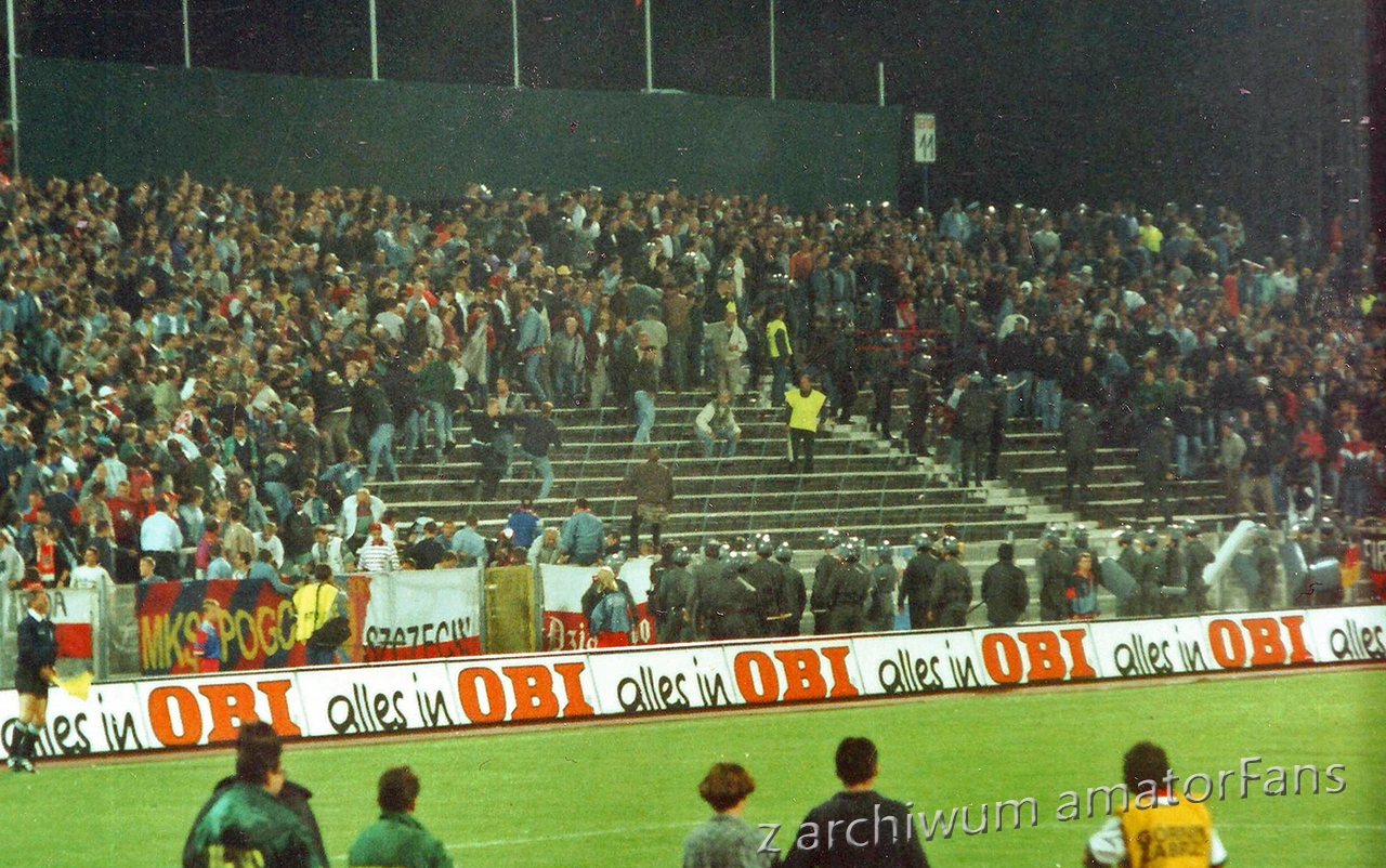 Wyruszamy z placu spod urzędu miasta w nocy 2-3 , nie wiem nie pamiętam. 2-3 autokary naprawdę „fajnej” ekipy. Jeszcze przed wyjazdem kierowcy jednego autokaru coś nie pasuje wiec szybka zrzuta i „dopłata”, jedziemy. W drodze jak zwykle gdzieniegdzie oczywiście promocje i jedziemy dalej. Z tego powodu jeden z autokarów ma problemy z milicja i stajemy na trasie i czekamy na nich. A był to autokar ten najbardziej „sportowy”, chociaż w sumie wszystkie autokary były ”sportowe”. Ogólnie podróż minęła spokojnie. Dojeżdżamy do Bytomia tam wysiadamy i udajemy się na rynek na którym czeka już Lech i Cracovia baaaardzo konkretne ekipy. Tam mała cola i hamburger i ruszamy na tramwaje. Na ten mecz już większość ekip w kraju oficjalnie zapowiedziała, że się nie pojawi ze względu na bardzo wysoką cenę biletu, rzeczywiście tak było. Ja sam bilet zakupiłem dopiero w tramwaju od chłopaka z Lecha, który miał ich chyba tyle co pani w kasie a sprzedawał je za 1/10 ceny Jesteśmy w Zabrzu. Tam milicja prowadzi nas podobno w całkiem innym kierunku niż stadion wiec ruszamy w stronę stadionu i się zaczęło – milicja na nas – i hasło pasów HEJ HEJ CRACOVIA ostre starcie na ulicy niestety dociskają nas pod bloki i ostre palowanie – oj ostre. Jakoś ustało i ruszamy na stadion, sektor i jesteśmy. Na stadionie poza nami razem L+A+C 300-400 osób tylko Górnik Zabrze był w większej ilości. Małe grupki Pogoni, Zagłębia Sosn, Legii kilku. Na stadionie pojawiają się szwabki w ponoć dobrej bandzie (podobno kilka stówek) większość łysi skini. Na meczu palą Polską flagę, przez co ciśnienie wzrasta, zamieszanie wykorzystuje bodajże Pogoń i kroi szwabkom ich flagę, wkracza milicja i niestety do starcia nie dochodzi. W czasie meczu kilku 4-5 L+A+C przeganiają pod stadionem 15-20 osób z Legii i Pogoni. Tego dnia nic szczególnego się już nie wydarzyło. Na stadionie zasiedliśmy na sektorze dla gości, Górnik siedział za druga bramka, a szwabki na prostej obok Pogoni. W tamtych latach mecze reprezentacji przynosiły naprawdę dużo „PRO-emocji” wiec było ciekawie.