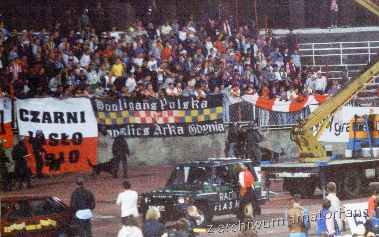Na ten mecz z Gdyni wybierała się dosyć duża ekipa fanatyków Arki. Z powodu braku autokarów oraz sporych wydatków składających się na ten wyjazd, wyjeżdża nas z Gdyni ok.200 osób. Dla nas, tczewskiej ekipy Arki wyjazd ten zaczął się już we wtorek ok. godziny dwudziestej. Wtedy to zaopatrzyliśmy się w alkohol i wyruszyliśmy do Gdyni, skąd ok. godziny drugiej w nocy mieliśmy wyjeżdżać do Zabrza. Podróż minęła spokojnie, gdyż prawie do Łodzi jechaliśmy pod eskortą debili w niebieskich mundurkach. Po dojechaniu do Bytomia idziemy na rynek, gdzie umówiliśmy się z Lechem i Cracovią. Tam też zaczyna się lekka popijawa i śpiewy. Z rynku wyruszamy na dworzec, skąd tramwajem i autobusem wyruszamy do Zabrza. Na miejscu, w drodze na stadion awantura, ponieważ nie chcieliśmy iść tą drogą którą prowadziły nas pały (a prowadzili nas dobrze). Wtedy zaczyna się niezła jatka, w ruch idą kije baseballowe i inny sprzęt, psy dostają niezłe lanie, po czym się wycofują. Gdy dochodzimy w pobliże stadionu dojeżdżają posiłki psów. Rzucamy w nich kamieniami, ale ci już leją na całego (po meczu dowiedzieliśmy się że ich dowódcą był gość, któremu na Polska – Rumunia złamaliśmy rękę). W końcu wchodzimy na stadion, gdzie zajmujemy cały sektor nr 6. Na obiekcie siedzą już kibice: Górnik Zabrze – 500, Ruch – 50, Katowice – 80, Sosnowiec- 50. Są też kilkuosobowe delegacje z innych klubów. Nas z Lechem i Cracovią jest ok. 400 osób. Na stadionie znajduje się już duża grupa skinheadów-chuliganów z Niemiec, którzy nieźle awanturują się z policją. Mecz obstawiała zbyt duża ilość psów, dlatego zbytnio sobie nie podymiliśmy, ale myślę że Szwaby patrząc na nasz trójkąt zorientowały się kto rządzi w Polsce. W drodze powrotnej spokój. Na koniec pozdrowienia dla chuliganów z Lecha i Cracovii.