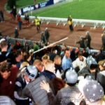 Zaraz po tej akcji „fryce” wyciągają mała flagę Polski i podpalają ją. My robimy dokładnie to samo z ich flagami. Psy nie pozostają obojętne na to co dzieje się na trybunie i zawijają „podpalaczy” zarówno z naszej strony jak i niemieckiej. Mimo iż nasza liczba zwiększyła się do około 50-60 osób to w stosunku do liczby niebieskich nie mamy szans na odbicie legionisty. Zresztą psy zbytnio się nie opierdalają, na „dzień dobry” napierdalają gazem. Dodatkowo konfiskują nam zdobyte flagi. Jeśli mnie pamięć nie zawodzi to już do końca meczu nie zarejestrowaliśmy żadnych akcji zaczepnych pomiędzy Niemcami, a Polakami.