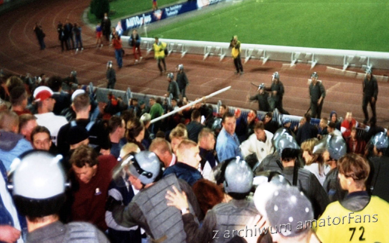 Gorąco było jedynie kiedy policjanci prowadzili szalikowców Legii na sektor tuż pod nosem fanów z Krakowa, Poznania i Gdyni. – Cracovia, Lech i Arka mają sztamę – stwierdził 20-letni „Ćwirek” z Gdyni. Do rozrób doszło tylko między kibicami Polski i Niemiec. Niemieccy goście, w większości pochodzący z landów byłego NRD, byli bojowo nastawieni. W stronę Polaków rzucali petardami. Nasi szalikowcy nie byli dłużni. – To zrobili mi polscy chuligani – skarżył się 29-letni Ingo z Brandenburga, któremu kamień rozbił głowę. – Wszyscy widzieli, że awanturę wszczęli niemieccy kibice. Całe szczęście została ona szybko powstrzymana – mówił z ulgą prezes PZPN Marian Dziurowicz. Poza wspomnianym incydentem podczas meczu było spokojnie. Tylko raz kiedy jeden z kibiców przeskoczył płot policjanci szybko opanowali sytuację szczując go psami.