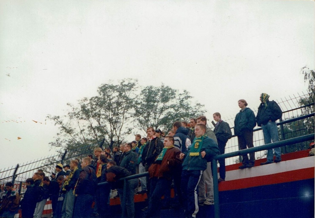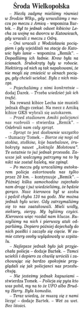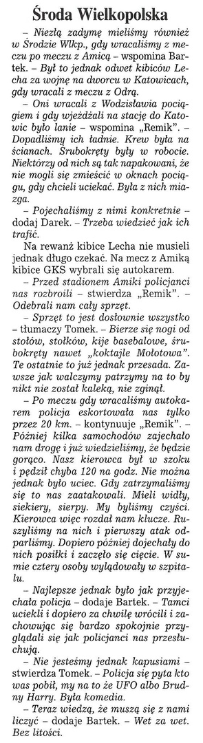 Na ten mecz jechaliśmy autokarem w sile 50 osób. Droga przebiegała spokojnie, lecz problemy z autokarem sprawiły że na mecz dojechaliśmy w drugiej połowie. Mecz nudny. Po szpilu wsiadamy do autokaru i ogólne wkurwienie, policja w czasie meczu przetrzepała nam autokar i pokasowała nam cały sprzęt. Mocno wkurwieni wyjeżdżamy z tej wiochy. Za poznaniem zauważamy że z zajazdu wyjeżdżają samochody, nie mamy wątpliwości że to pyrusy. Jeden z samochodów zajeżdża nam drogę, wtedy zjeżdżamy na zajazd aby podjąć walkę. Wyskakujemy na nich, początkowo lechici, którzy wyskoczyli z pierwszych aut wycofali się lecz po dojechaniu pościgu uzbrojeni po zęby odpierają atak. Zaczynamy uciekać, połowa z nas kryje się w autokarze a reszta ucieka do zajazdu itp. Tych których złapali dostali porządny wpierdol. Kilku od nas musi skorzystać z pomocy medycznej. Lech rozwalił nam doszczętnie autobus (wybili wszystkie szyby) i wrzucili nam bulwy do środka tzn. symbol Poznania. Po czym spokojnie odjechali. Nic nam nie skroili. Po kilkunastu minutach przyjeżdża psiarnia, zawiadomiona przez personel baru. Niczego się od nas nie dowiadują. I eskortują nas na dworzec do Środy Wlkp. Do Katowic wracamy cugiem.