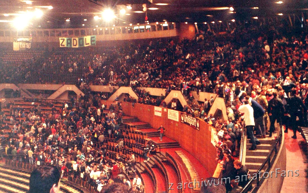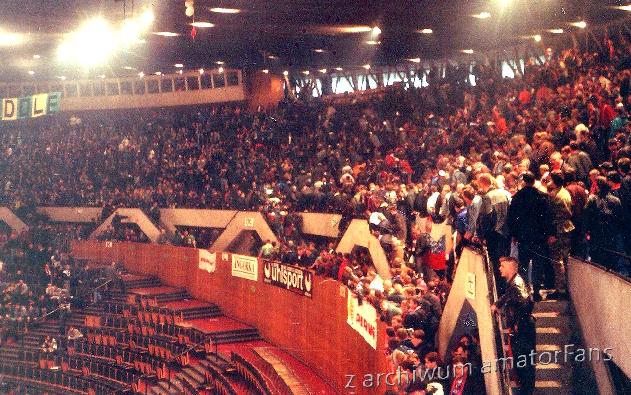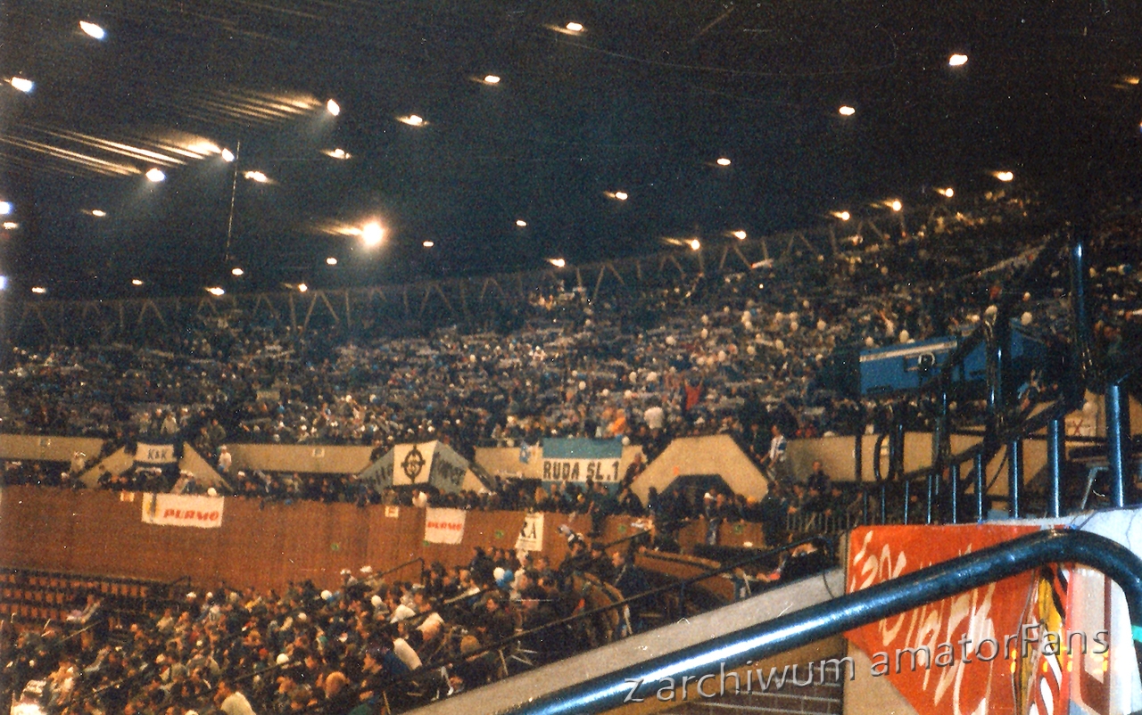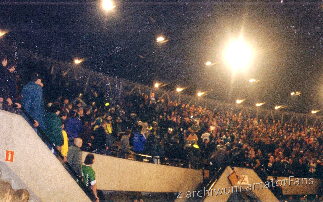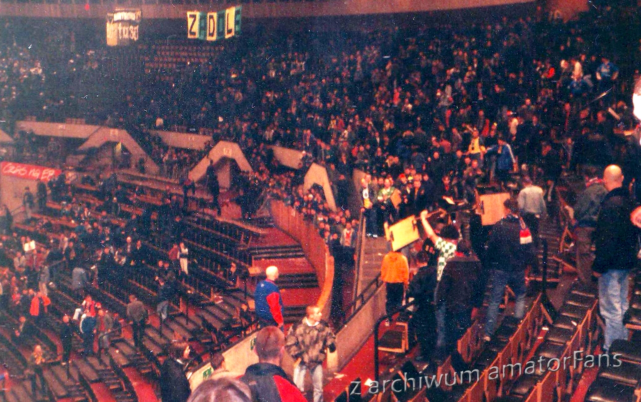 W końcu Spodek zaczął się wypełniać. Nasze miejsca były tak usytuowane, że po prawej stronie nie było obok nas nikogo. Po lewej był sektor wolny (rok wcześniej siedział tam Widzew). Nas razem z Odrą Wodzisław (zgoda już praktycznie w tamtym okresie zdychała, ale wodzisławianie grali na tym turnieju, więc siedzieli z nami) ok. 180 (z Wodzika maksymalnie 30 typa), przy czym nie wszyscy weszli na halę, bowiem nie każdy z potrzebujących zdołał zaopatrzyć się przed halą w wejściówki (ostatni weszli dopiero po zamieszkach).