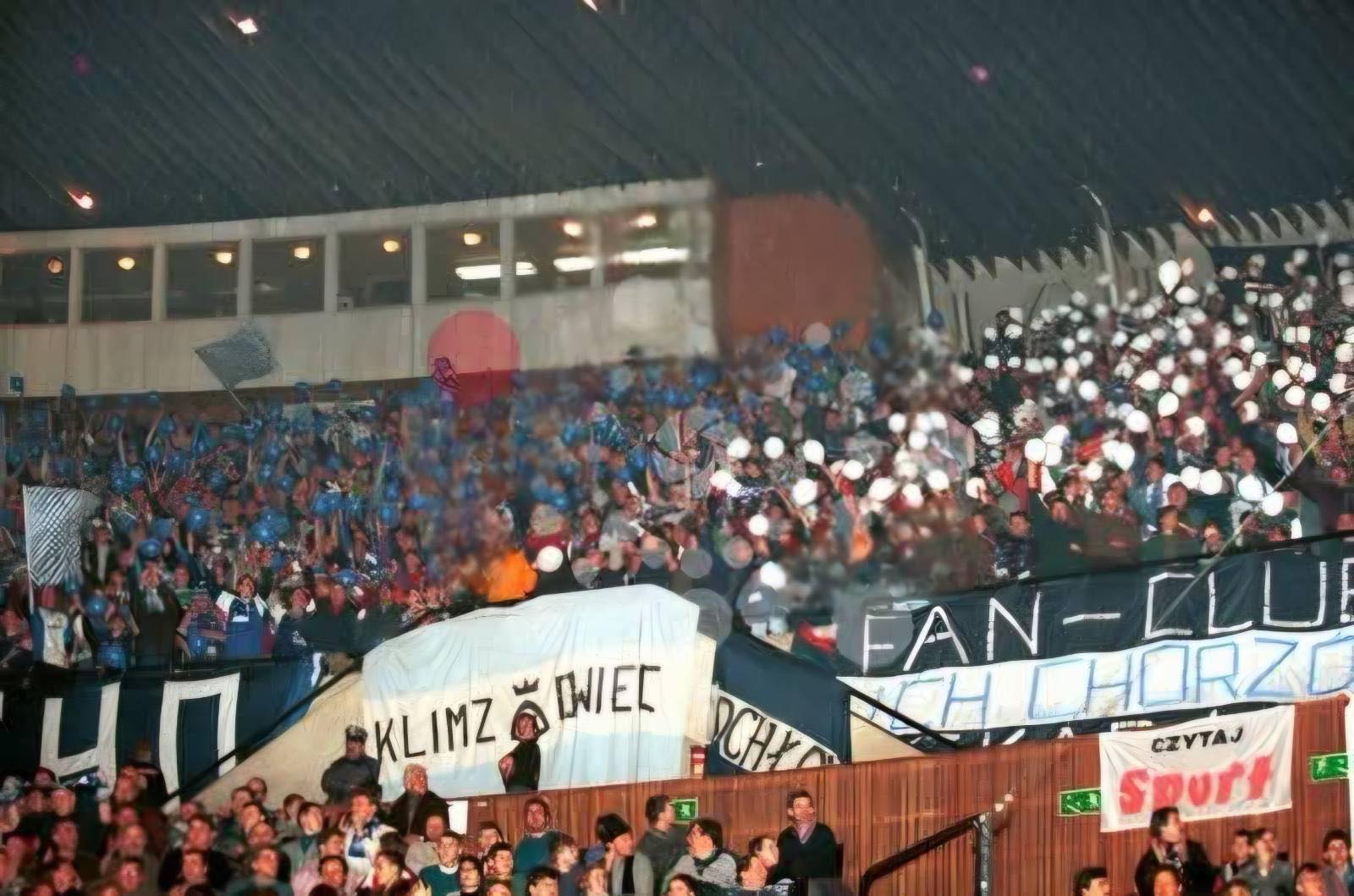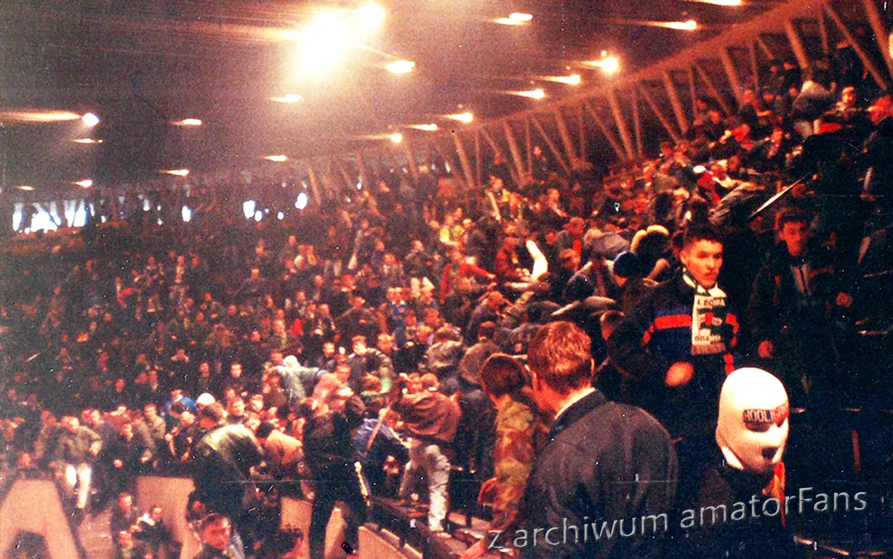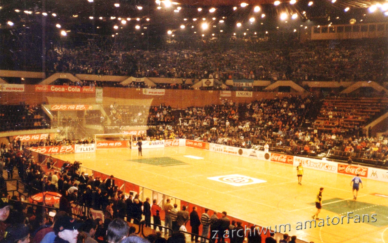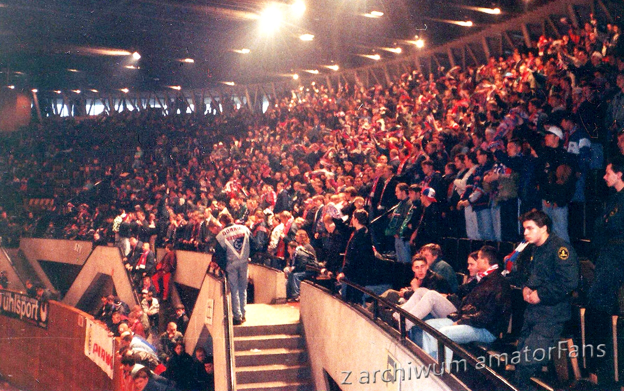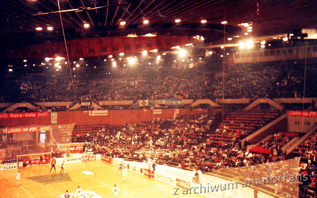 W końcu Spodek zaczął się wypełniać. Nasze miejsca były tak usytuowane, że po prawej stronie nie było obok nas nikogo. Po lewej był sektor wolny (rok wcześniej siedział tam Widzew). Nas razem z Odrą Wodzisław (zgoda już praktycznie w tamtym okresie zdychała, ale wodzisławianie grali na tym turnieju, więc siedzieli z nami) ok. 180 (z Wodzika maksymalnie 30 typa), przy czym nie wszyscy weszli na halę, bowiem nie każdy z potrzebujących zdołał zaopatrzyć się przed halą w wejściówki (ostatni weszli dopiero po zamieszkach).