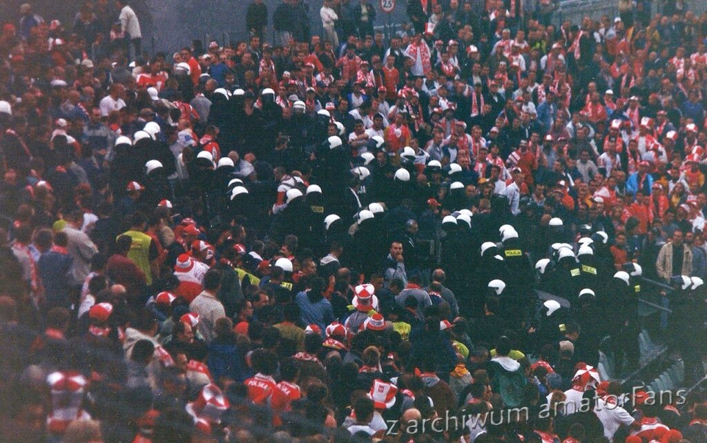 Polska – Norwegia! Mecz ten miał przesądzić o tym, czy Polska po 16 latach awansuje do MŚ. W dniu meczu jeszcze napięcie zerowe. Wstałem, zacząłem szukać szalików, może jakieś fany na plecy. Mieszkam w sąsiedztwie Stadionu Śląskiego więc od rana można było z okna zobaczyć pielgrzymki kibiców w stronę monopoli, czy to po prostu zwiedzających i podróżujących z buta w stronę stadionu. Po obiadku z kuzynem lądujemy na małym z pianką w pobliskim pawilonie. Szybka rozmowa na temat meczu i wracamy na „grubą” aleję, by dojść do wejścia. Mija kilka chwil i meldujemy się pod sektorem 37, brama numer 6. Spotyka nas tam to co zawsze czyli: „kurwa mać ile mamy stać” i próba wejścia z bramą. Jako, że moje gabaryty nie powalają, musiałem dzielnie odpierać napór pchających się sfrustrowanych osób 🙂 Po wdrapaniu się na koronę stadionu lądujemy na samej górze sektora. Już po hymnach zaczynamy obserwować, czasem coś dopingować (każdy wie jak na Śląskim wygląda akustyka). Po chwili okazuje się (jak zawsze kurwa z moim szczęściem), że wylądowałem w sektorze niebieskiej „r”. Trudno, w końcu to reprezentacja. Oczywiście kuzyn, z którym to radośnie piłem to z pianką mówi, że bilety kupił w OZPN, na Francuskiej z normalnej puli. Mecz to typowa nerwówka, Polska czuła presję jaka leży w tym spotkaniu. Przed przerwa w naszym sektorze zaczyna się mały młyn. Niebiescy zaczynają mały kocioł, z lewej strony zaczyna się mini show na paski przez płot ze Śląskiem Wrocław, z prawej wjeżdża ochrona i wdupia gaz. Polska strzela bramkę, której nie widzę i tak kończy się pierwsza połowa historycznego meczu.