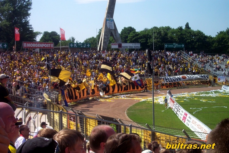 Na stadionie Dynama Drezno zawisła flaga „BAD BOYS” kibiców GKSu Katowice, należąca do fana zamieszkującego okolice Drezna. Fani Dynama prezentują m.in. oprawę zatytułowaną „Ciao Jungs!” oraz trochę zdobycznych fantów, w tym szale i flagę. Przyjezdni pojawili się w kilkadziesiąt osób i również ultrasowali.