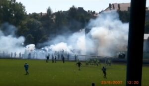 Nas ok. 100, w tym jedna osoba z Unii i 10 z Czuwaju! W przerwie meczu przez nieuwagę tracimy cześć jednej naszej fany. Próbujemy wyskoczyć po odbiór jej, lecz psy nas pałują, a ochrona gazuje. Przez prawie całą II połowę dymimy z psami i ochroną (mecz kilkakrotnie przerwany). W czasie meczu zostało zawiniętych 22 osoby od nas! Mieliśmy lipę z psami, więc nie daliśmy rady się bić po meczu na ustawce.