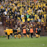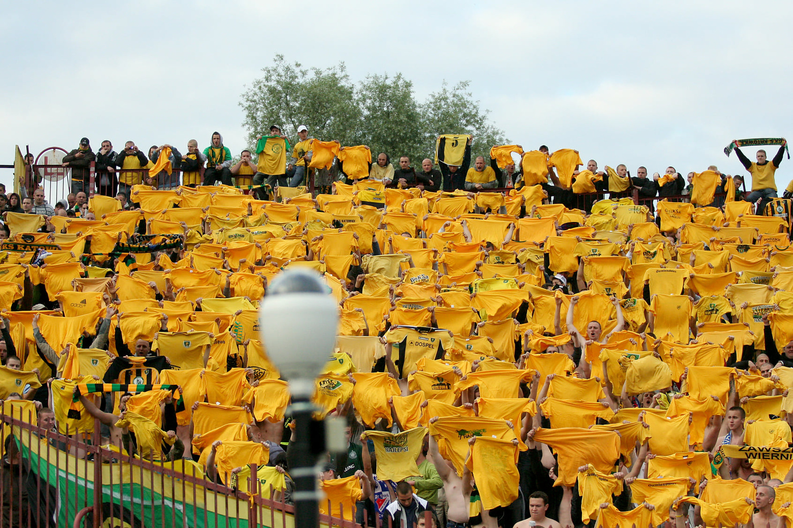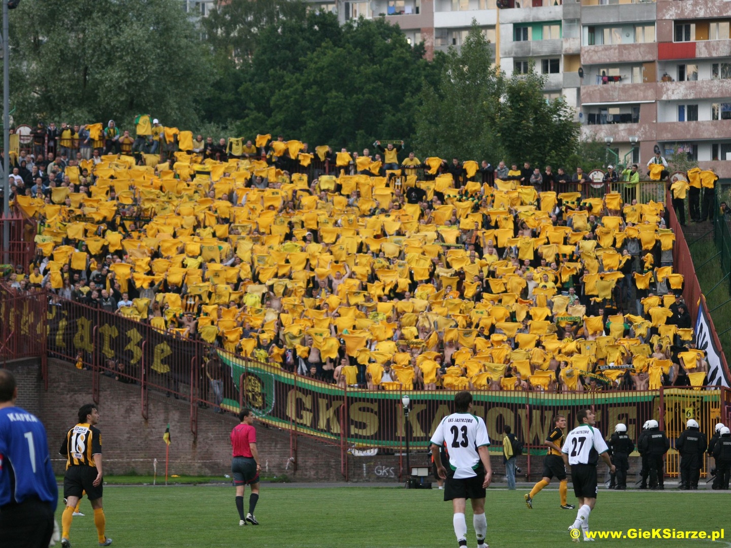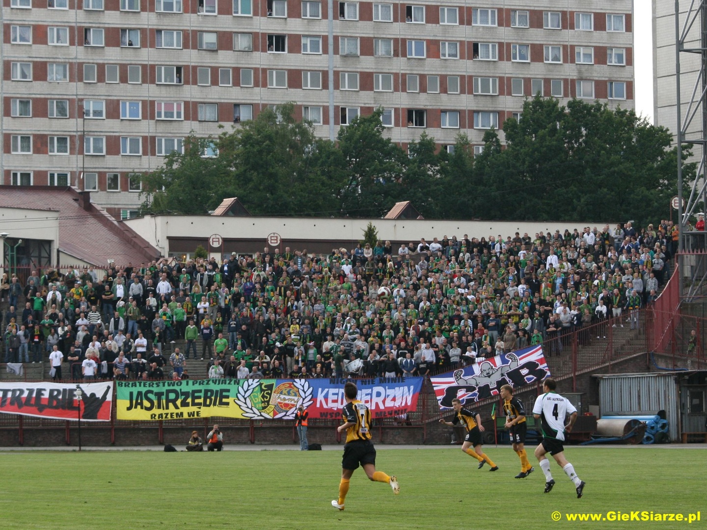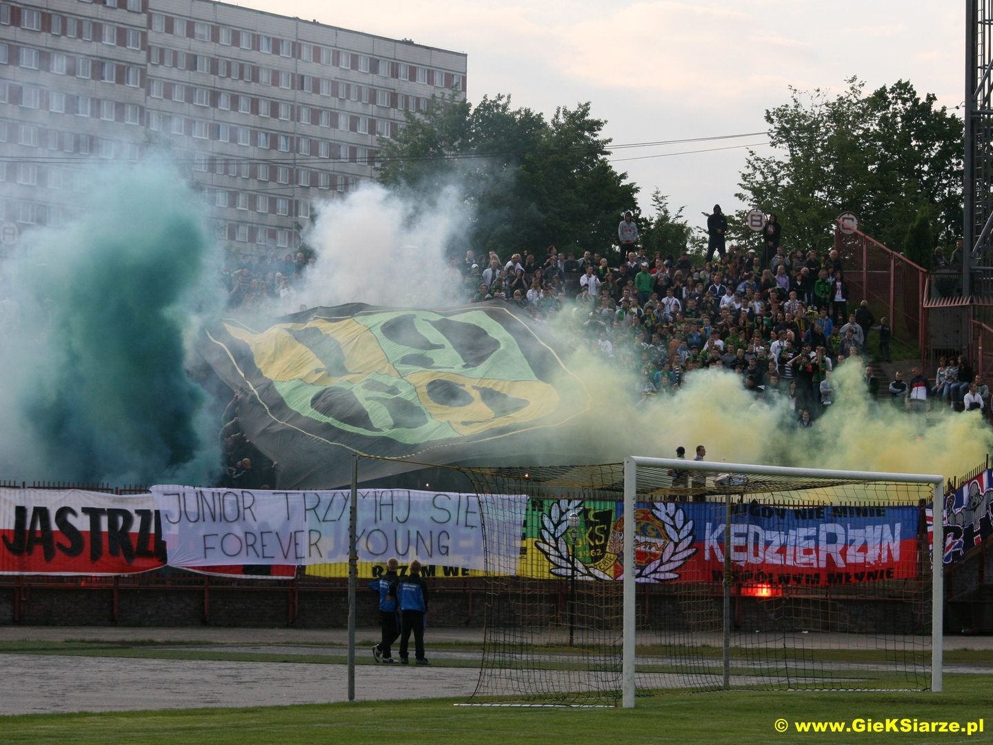 Kiedy w terminarzu przydzielono nam w ostatniej kolejce wyjazd do Jastrzębia, było wiadomo, że będzie to mecz, który każdego fana GieKSy przyprawi o skok adrenaliny. Nikt jednak nie spodziewał się, że w tym spotkaniu piłkarze obu zespołów będą walczyć o uniknięcie baraży, o utrzymanie w 1 lidze. Jednak kiedy tak się stało, jasne było iż na ten wyjazd będzie panowała w naszej ekipie ogromna mobilizacja. Przygotowania do wyjazdu zaczęły się już na 2 tygodnie przed nim. Już tydzień wcześniej mieliśmy prawie 800 chętnych na ten wyjazd, jednak zaczęły się problemy z liczbą biletów na to spotkanie. Zarząd z Jastrzębia upierał się, że da nam 500 biletów i ani jednego więcej. Wtedy zapadła u nas decyzja, że 500 osób z biletami będzie podróżowało na mecz przegubami, zaś Ci bez biletów wybiorą się do Jastrzębia na auta. Tak też się stało i na zbiórce zaplanowanej na parkingu OBI na Brynowie zebrała się ogromna ilość aut. Szybki i bezproblemowy przejazd pozwolił nam zameldować się pod bramami naszego sektora już na godzinę przed meczem. Ochrona bardzo drobiazgowo sprawdzała i chwilę przed rozpoczęciem meczu 500 osób było na sektorze, reszta czekała pod bramami na dodatkowe bilety. Pod kasami dochodzi do zamieszek i ostatecznie dostajemy bilety dla wszystkich. Około 30 minuty meczu byliśmy pełną 1227 osobową grupą na sektorze dla gości. Co ciekawe, kiedy jeszcze większość wyjazdowiczów stało za bramą, gola dla GieKSy zdobył popularny Miki, co ostatecznie zadecydowało o naszym utrzymaniu. Doping tego dnia był naprawdę dobry, na płocie zawisły 4 flagi, wszyscy z nas byli ubrani w żółte koszulki, co dało fajny efekt. W 60 minucie spotkania ultrasi zaprezentowali oprawę z transem Silesian Hunters, zaś na sektorówce znalazło się 4 typów w barwach GieKSy i Banika. Ponadto na bieżni wylądowało ok. 20 ogni wrocławskich. Później nasz doping był jeszcze lepszy, bawiliśmy się jak rzadko aż do końca tego zwycięskiego dla nas meczu. A po szpilu nadszedł czas na radość wraz z piłkarzami, która była świetną nagrodą dla nas i dla nich za ten trudny sezon. Po meczu chwilę jeszcze zostaliśmy na sektorze i w doskonałych humorach wróciliśmy do Katowic, gdzie większość z nas udała się na imprezy świętować utrzymanie GieKSy.