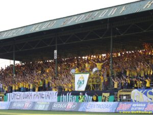 Nasza drużyna bardzo kuleje w obecnym sezonie, ciągłe remisy, blamaż w pucharze, i teraz kolejna przegrana na własnym boisku. Jednak kibice nadal pokazują, że GieKSa to My i dlatego od początku meczu kopacze mogli słyszeć doping na bardzo dobrym poziomie. Zwłaszcza w drugiej połowie gdzie do gniazda zaproszono wielu bajtli, którym podczas meczu rozdawane były plany lekcji, balony itd. Akcja żółte koszulki udała się w 99% i jak zwykle dała bardzo fajny efekt, szkoda tylko, że trafił się ktoś kto po wejściu na sektor, ściągał ją… cóż bywa i tak. Po meczu poleciały słowa oburzenia w kierunku piłkarzy, którzy po raz kolejny pokazali bardzo mizerny poziom piłkarski. Ciekawostką jest, że w drużynie Kolejarza grał znany z Bukowej Krzysztof Markowski, który po meczu też klaskał w stronę Blaszoka. Warto nadmienić, że w dniu meczu minęła kolejna rocznica śmierci Tomka Dury, wiernego kibica, który zginął tragicznie w drodze na mecz z Koroną. Pod zegarem paliły się znicze. a kibice skandowali: „Tomek Dura GKS”. Słuchając komentarzy po meczu, ciśnienie na piłkarzy, trenera i pana Króla jest ogromne. Czy zmieni się to? Czas pokaże.