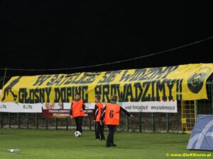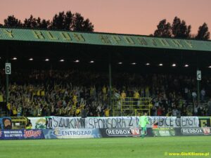 Jeśli chodzi o trybuny to piłkarze mogli liczyć na fanatyczny doping przez całe spotkanie. Kibice jednak kolejny raz wytykają nieudolnośc zarządu treściwym transparentem „SZUKAMY SPONSORA Z KASĄ KIBICE GIEKSY”. Poza tym innym płótnem przypominają i mobilizują się na mecz hokeja w Satelicie. Poza tym cieszy pierwsze zwycięstwo naszych piłkarzy i to w takim stylu. Miejmy nadzieje ze nasi piłkarze się przełamali bo już w sobotę gramy z liderem naszej ligi Zawiszą Bydgoszcz. Na ten mecz serdecznie wszystkich zapraszamy.