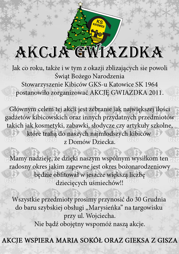 Tradycyjnie jak co roku organizujemy „Akcje Gwiazdka” która ma na celu zbiórkę artykułów spożywczych, słodyczy, nowych zabawek czy też środków czystości dla domów dziecka. Mamy nadzieje ze w tym Świątecznym okresie każdy dołączy się do akcji i wspomoże razem z nami domu dziecka w Katowicach.