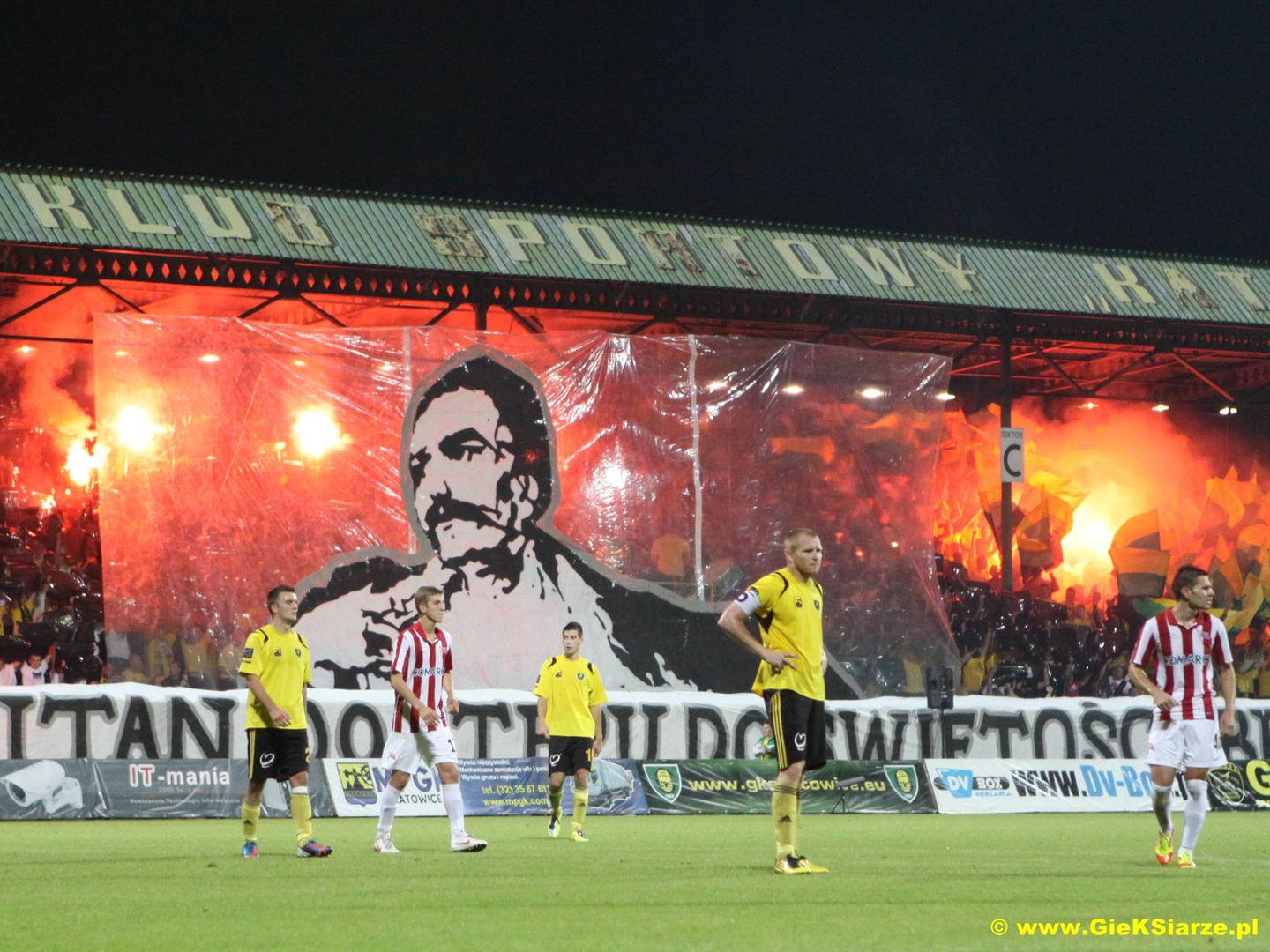Oflagowanie: NASZE MIASTO NASZA KREW NASZE ŻYCIE – GKS KATOWICE, GLADIATORS, GKS KATOWICE, PIEROŃSKIE HANYSY, PISAK, PSEUDOKIBICE KOCHAJĄ ŚLĄSKA STOLICE (debiut – replika), GKS GKS KATOWICE-FANS JESTEŚMY JAK ZARAZA, GIEKSA&BANIK, FORZA GKS, GIEKSA&GÓRNIK i na gnieździe UG.