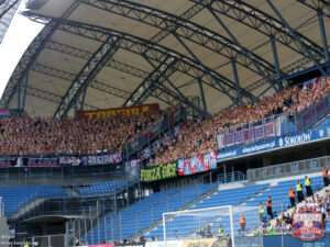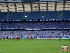 My za to tego dnia wypadliśmy słabiej niż zwykle. Wysoka frekwencja – 27130 osób nie gwarantowała lepszego dopingu, w sytuacji gdy tylko Kocioł bez względu na wydarzenia boiskowe śpiewa lepiej lub gorzej przez cały mecz. Niestety nawet gdy jakaś przyśpiewka wychodziła tego dnia dobrze, to buczenie, gwizdy, aplauz i inne żywiołowe reakcje gawiedzi z pozostałych trybun na wydarzenia boiskowe rozmywały głos płynący z Kotła, w efekcie czego zamiast rytmicznego śpiewu słychać było tylko szum. Sam Kocioł też tego dnia nie był w najlepszej formie. W pierwszej połowie słabo słychać było bęben, w drugiej gdy sytuacja uległa poprawie okazało się, że nadal niektórzy nie potrafią zsynchronizować klaskania z rytmem wygrywanym przez bębniarzy.