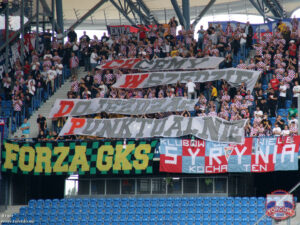 Górnik wywiesza tego dnia mnóstwo flag, nie zostawiając żadnego wolnego miejsca na płotach, my mamy ze sobą jedno płótno – FORZA GKS.