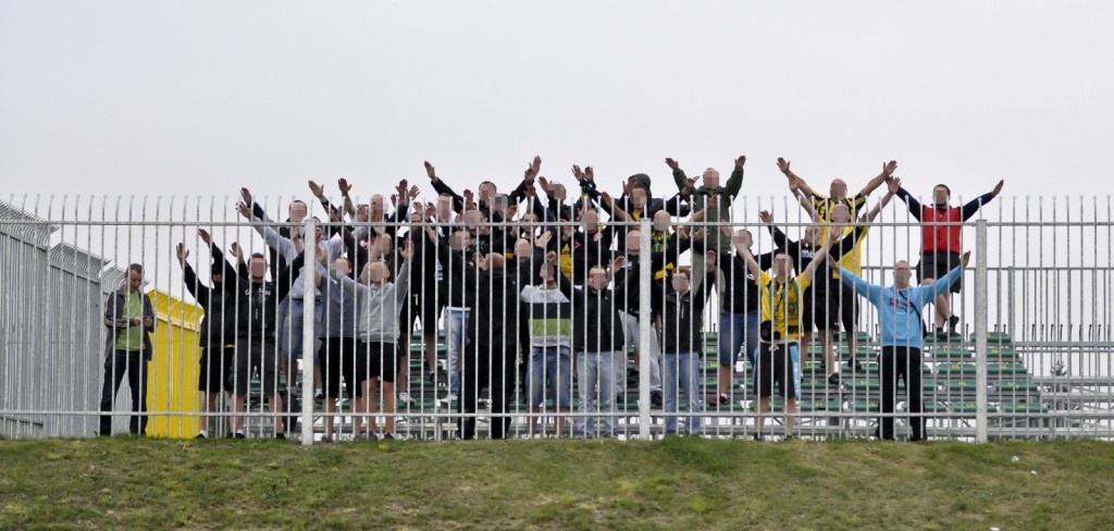 Gdy zbliżamy się do celu miejscowe wąsy nas wyczaiły i zaczął się tradycyjny cyrk: spisywanie, sprawdzanie itd. Pod stadionem zostaje jeden zakazowicz od nas, reszta melduje się na sektorze. Nie mamy ze sobą żadnej flagi i prowadzimy rwany doping, jednak na taka liczbę nie było źle. Mecz wygrywamy 2:0 i kierujemy się w stronę stolicy Górnego Śląska.