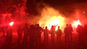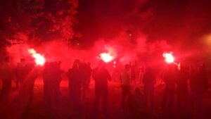 Po meczu na Giszowcu miejscowi kibice robią sobie pochód przy głośnym dopingu. Kulminacja nastąpiła na ul. Miłej gdzie została odpalona pirotechnika i głośno zaznaczyliśmy miejsce koleżanek zza miedzy.