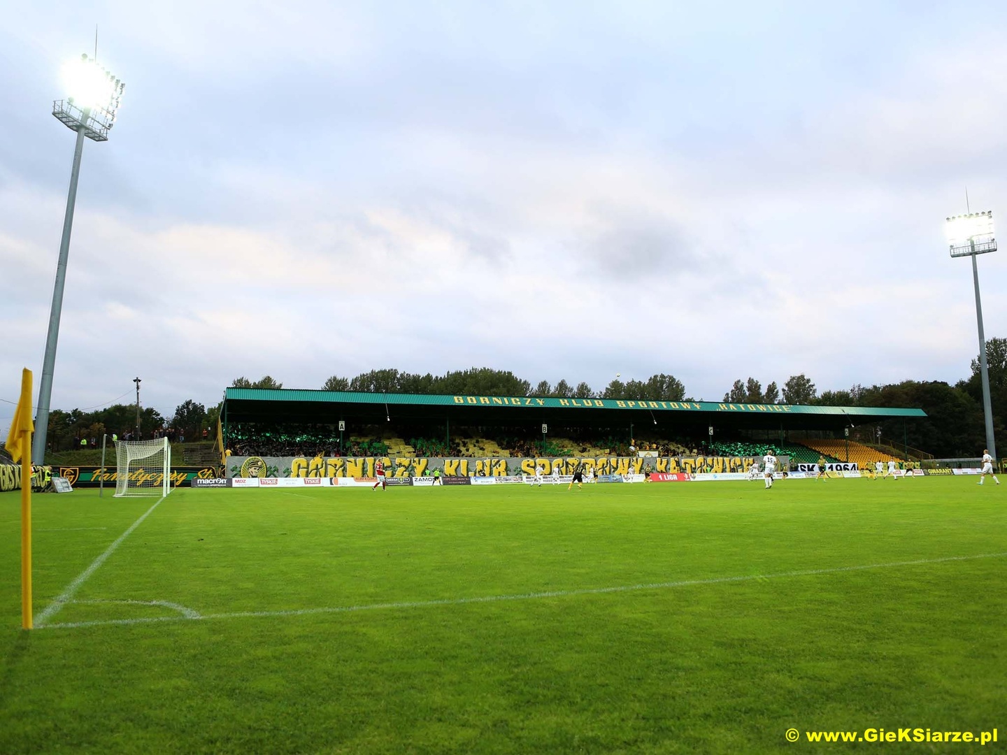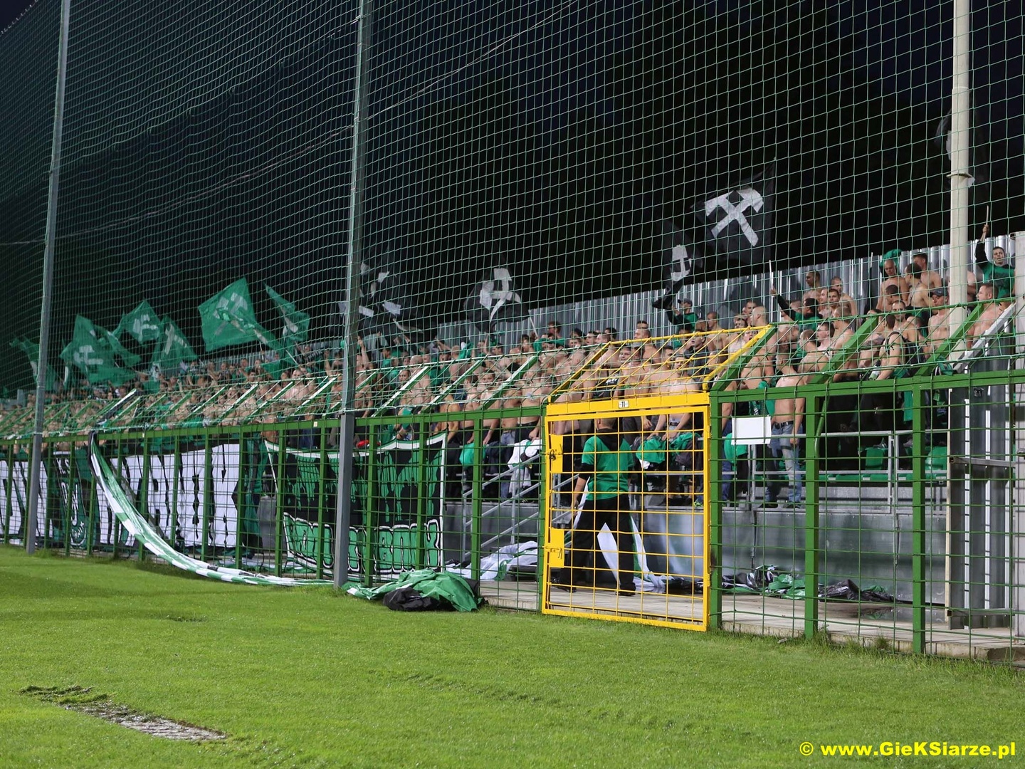 Oflagowanie: Trans MŁODZI KIBICE KOCHAJĄ GKS KATOWICE (S2), NASZE MIASTO NASZA KREW NASZE ŻYCIE – GKS KATOWICE (łuk), FANATYCZNY STYL ŻYCIA, PSEUDOKIBICE KOCHAJĄ ŚLĄSKA STOLICE, SLEZSKA OSTRAVA (Banik), PIEROŃSKIE HANYSY, GKS KATOWICE, trans ADRIAN TRZYMAJ SIĘ, TRÓJKOLOROWA ARMIA, SK1964, FORZA GKS oraz na gnieździe UG.