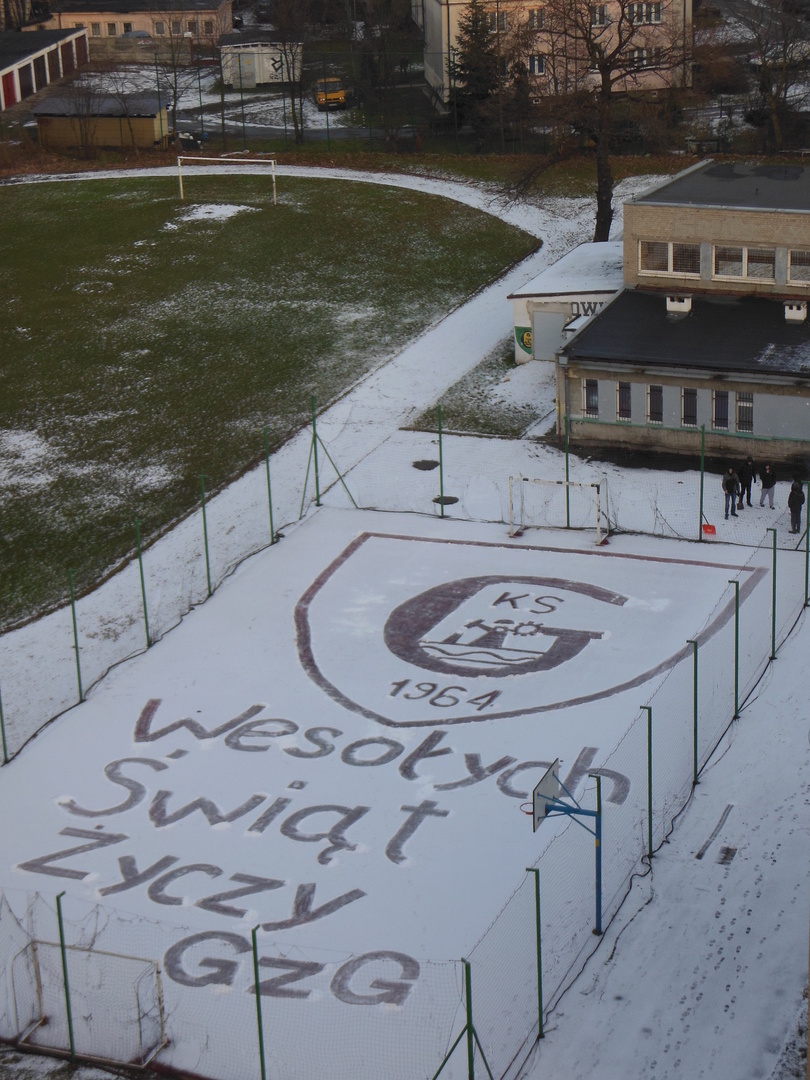 Święta Bożego Narodzenia to wyjątkowy okres który porusza serca ludzi do różnego rodzaju działania. Dlatego też kibice GieKSy prześcigali się w różnego rodzaju pomysłach. Na początek tuż przed Świętami na jednym z boisk do piłki nożnej na śniegu został namalowany herb GKS-u Katowice z życzeniami Świątecznymi od GieKSy z Gisza