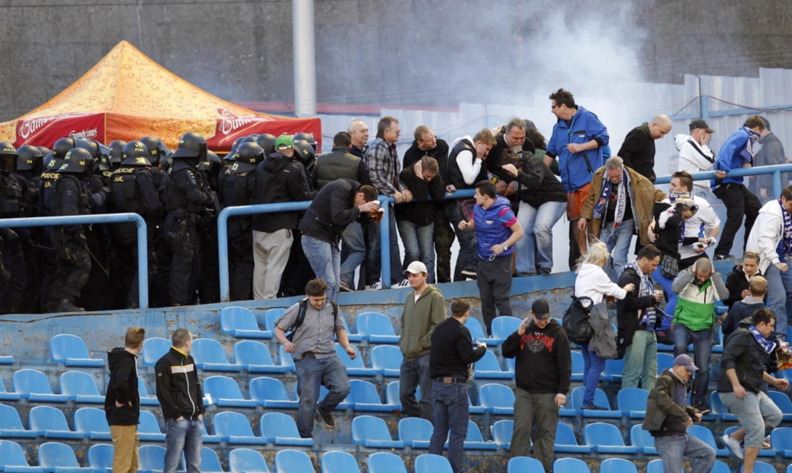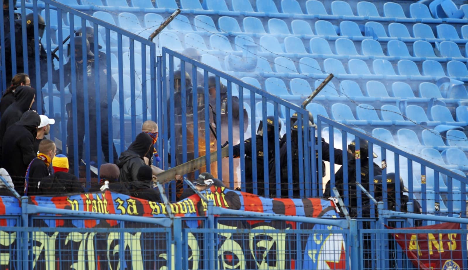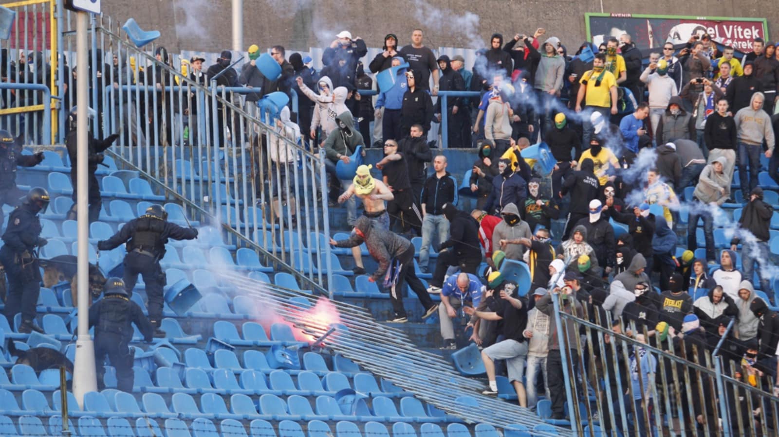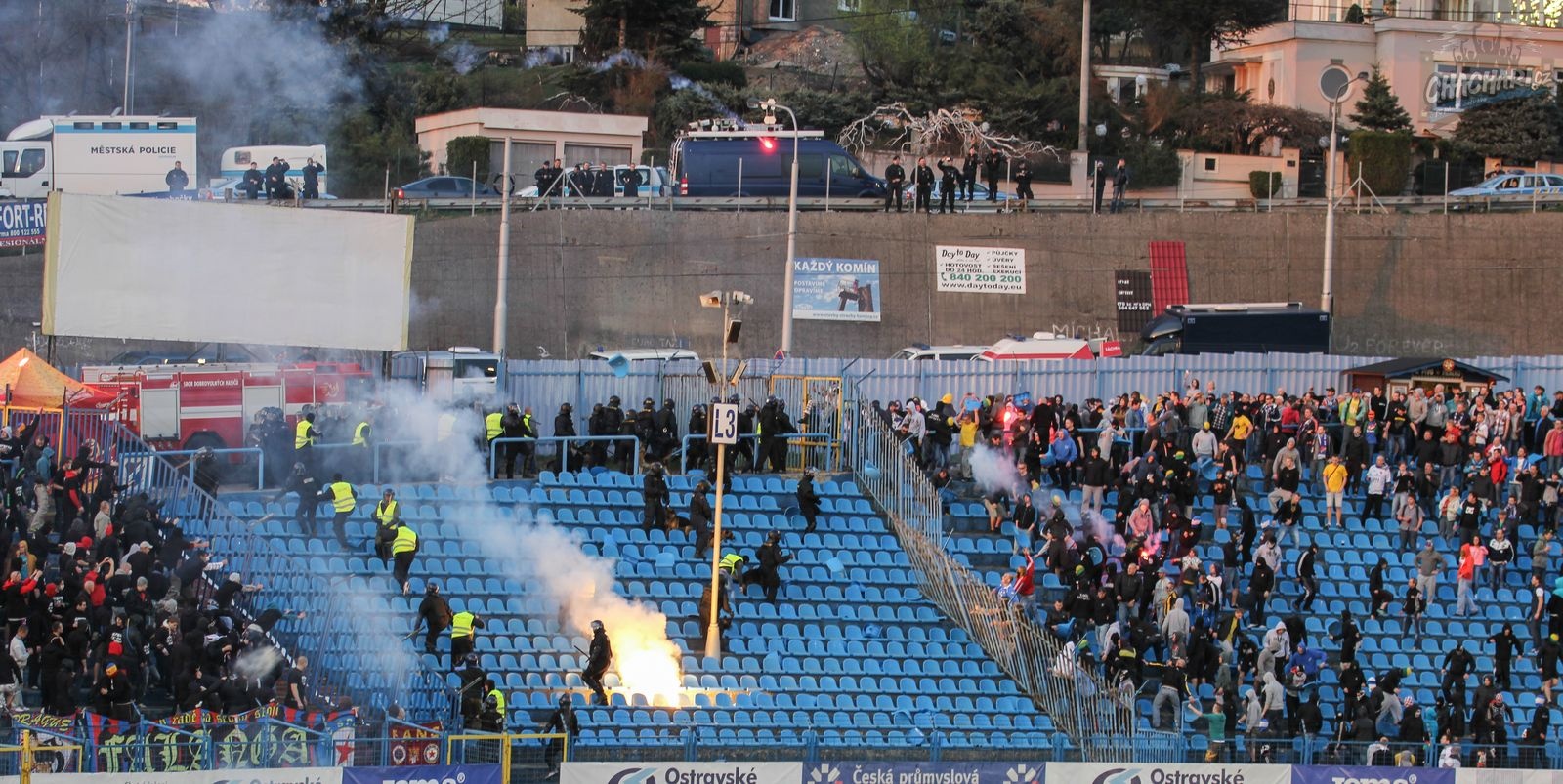 W przerwie meczu chuligani Banika i GieKSy szturmują płot dzielący bufor do sektora gości. Sparta próbuje zrobić to samo jednak z gorszym skutkiem bo nie udało im się przerwać ogrodzenia. Na dziurę w płocie po stronie gospodarzy zareagowała czeska prewencja częstując kogo popadnie granatami hukowymi. Od tego momentu zaczął się kilkunastominutowy maraton walk kibiców z policją. Gdy sytuacja się uspokoiła piłkarze wyszli ponownie na murawę i rozpoczęto drugą połowę spotkania.
