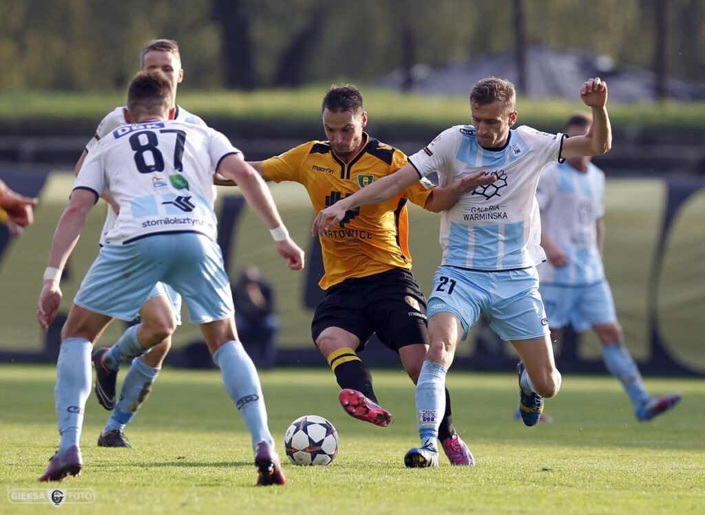 Olsztynianie także stworzyli sobie okazje, ale nie potrafili zwieńczyć ich bramką. Z ostrego kąta już w 7. minucie strzału próbował Karol Żwir, ale świetną „robinsonadą” popisał się Rafał Dobroliński, a w ostatniej akcji pierwszej połowy Tomasz Wełna ze szczupaka posłał piłkę nad poprzeczką bramki GKS-u.