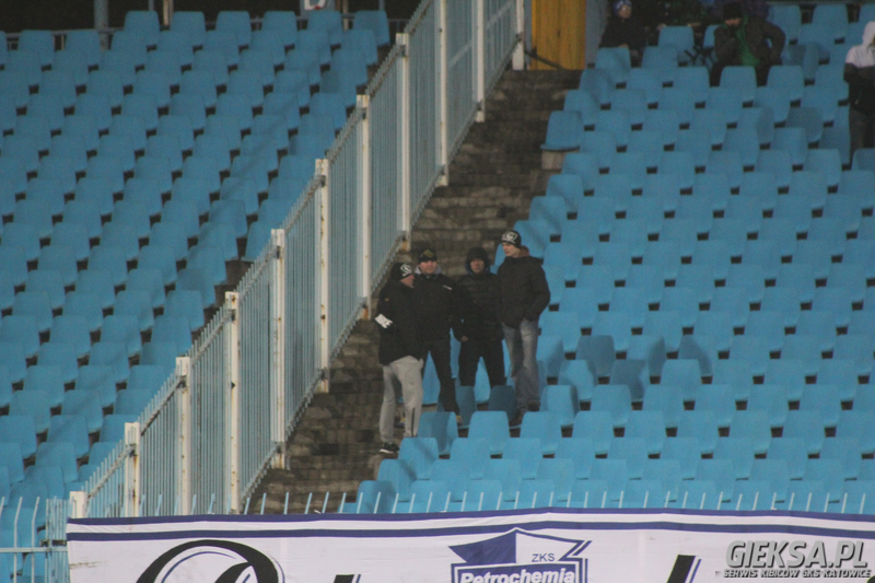 W piątek 13-tego nasza drużyna rozgrywała swój mecz w Płocku, ponieważ PZPN nałożył na nas zakaz nie mogliśmy oficjalnie się tam pojawić. Mimo to wyruszamy jedną furą do miasta Nafciarzy. Po drodze sporo remontów, i co za tym idzie zaliczyliśmy parę „korków”. Przez co musieliśmy co chwila nadrabiać, by się nie spóźnić. Jednak nasze plany popsuli mundurowi którzy się doczepili do nas już pod stadionem. Spisywanie i przeszukiwanie którego nie uniknęliśmy zwróciło uwagę gospodarzy którzy przyszli nam z pomocą i tak wchodzimy w ok. 35 min na ich sektory. Zasiadamy nie daleko młyna Petry w 4 osoby i zaznaczamy kilkoma okrzykami swą obecność. Na trybunie głównej zasiada inne grupka GieKSiarzy co daje w sumie liczbę ok. 10.