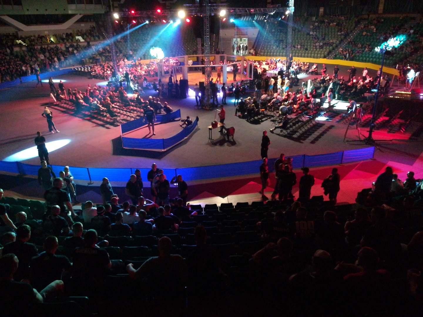 Przejdźmy jednak do samej gali której start miał odbyć się o 21:00. Wszystko się jednak opóźniło ponieważ większość kibiców zamiast być na trybunach, to stała nadal w kolejce. Dodam że winę za to nie ponoszą organizatorzy, bo wejście było sprawne. Widocznie większość wejście na hale przekładało do ostatniej chwili.