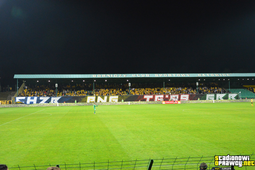 Przechodząc do Nas to na Bukowej zasiadło 3710 widzów, co trzeba uznać za słaby wynik. Pocieszające jest jednak to że Blaszok w końcu wyglądał dobrze. Mało tego, bo jeszcze lepiej dopingował. Widać było że brakowało takich spotkań katowickiej publiczności. W większości ubrani jesteśmy na żółto, jednak nie w zdecydowanej co powinno wielu dać do myślenia. Jest z nami tego dnia 145 fanów Banika (zasiedli na sektorze „A”) oraz 50 Gladiatorów z ROW-u Rybnik – dzięki za wsparcie. Przez całą pierwszą połowę przed Blaszokiem prezentuje się ogromny transparent „CHZB PNG TG’99 GRR”, by w drugiej części spotkania stał się elementem oprawy w skład której wchodziły machajki w barwach wszystkich czterech zaprzyjaźnionych ekip oraz odpalone stroboskopy. Całość dała super efekt. Goście też nie próżnowali i chwilę później wszyscy ubrali się w zielone pelerynki oraz maski lekarskie. Ściągnęli flagi z płotu i można by było pomyśleć że będą chcieli ruszyć w naszą stronę (nie w tym życiu), jednak zamiast tego wyciągnęli starą zdobytą w 2004 roku flagę Banika. Z naszej strony natychmiastowa reakcja i następuje walka z ochroną. Goście też chwilę poszarpali płotem. U nas akcja głównie rozegrała się na górze Blaszoka by wtargnąć na sektor „D” (buforowy). Udaje się nam po chwili przepędzić ochronę, jednak chwilę później pod natężeniem gazu musimy się wycofać. Tyle tego było że ludzie zasiadający na sektorach „B” i „C” również odczuli skutki rozpylenia tego ścierwa. Jeśli chodzi o wydarzenia na murawie to nie ma o czym pisać. Nasi kopacze przegrywają ważny mecz co staje się u nas powoli tradycją, mimo to po spotkaniu z Blaszoka usłyszeć można było „czy wygrywasz czy nie…”.