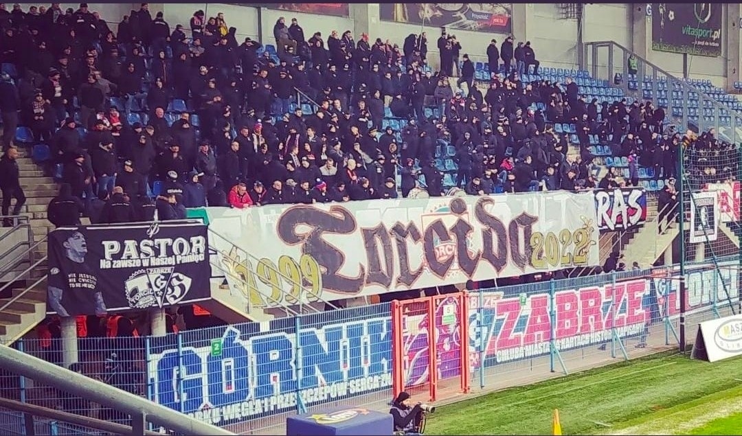 Dopiero co Torcida 2,5 tygodnia temu była na Okrzei, a tu znowu trzeba było obrać kierunek na Tesco kurczaków. Zabrzanie do Gliwic ponownie ruszyli spod stadionu Górnika autobusami miejskimi. Wejście sprawne, a w sektorze gości zasiadł komplet – 480 osób, w tym po 10 osób z GieKSy, ROWu i Wisłoki. Na wyposażeniu zabrzan były takie flagi jak: GÓRNIK ZABRZE, TORCIDA GLIWICE, TORCIDA RYDUŁTOWY, DUMA ŚLĄSKA (GKS), ŚP. PASTOR, KS WISŁOKA, ULTRAS, TORCIDA RUDA ŚLĄSKA, PATRIOCI. Na początku w centralnym miejscu sektora wisi ogromny transparent „1999 TORCIDA 2022”, co ma związek z 23 jubileuszem najzagorzalszej grupy fanatyków przy Roosevelta. Później zastępuje go inny, skierowany do zgodowiczów z Katowic, ponieważ 27 lutego swój jubileusz obchodzi również Górniczy Klub Sportowy. Płótno „GIEKSA WSZYSTKIEGO NAJLEPSZEGO – 58 LAT” wcześniej wisiało na turnieju w Piotrowicach. Poza tym pojawił się jeszcze trans „FIFI TRZYMAJ SIĘ” dla kibica z Dębicy.
