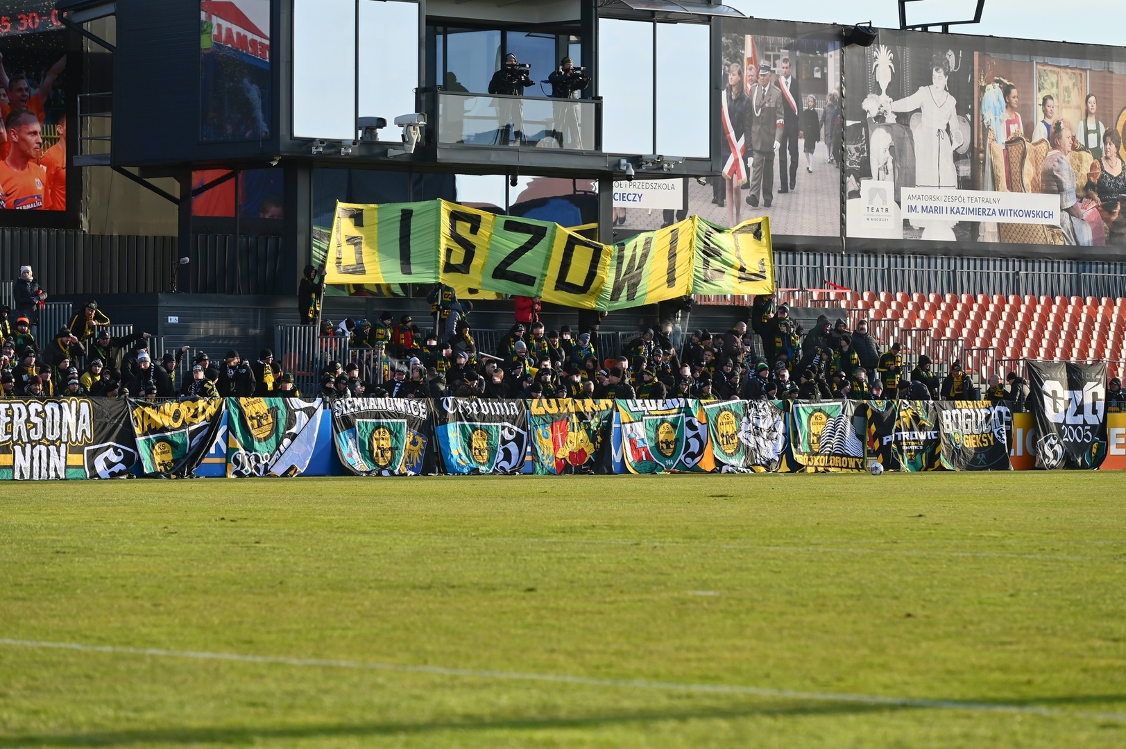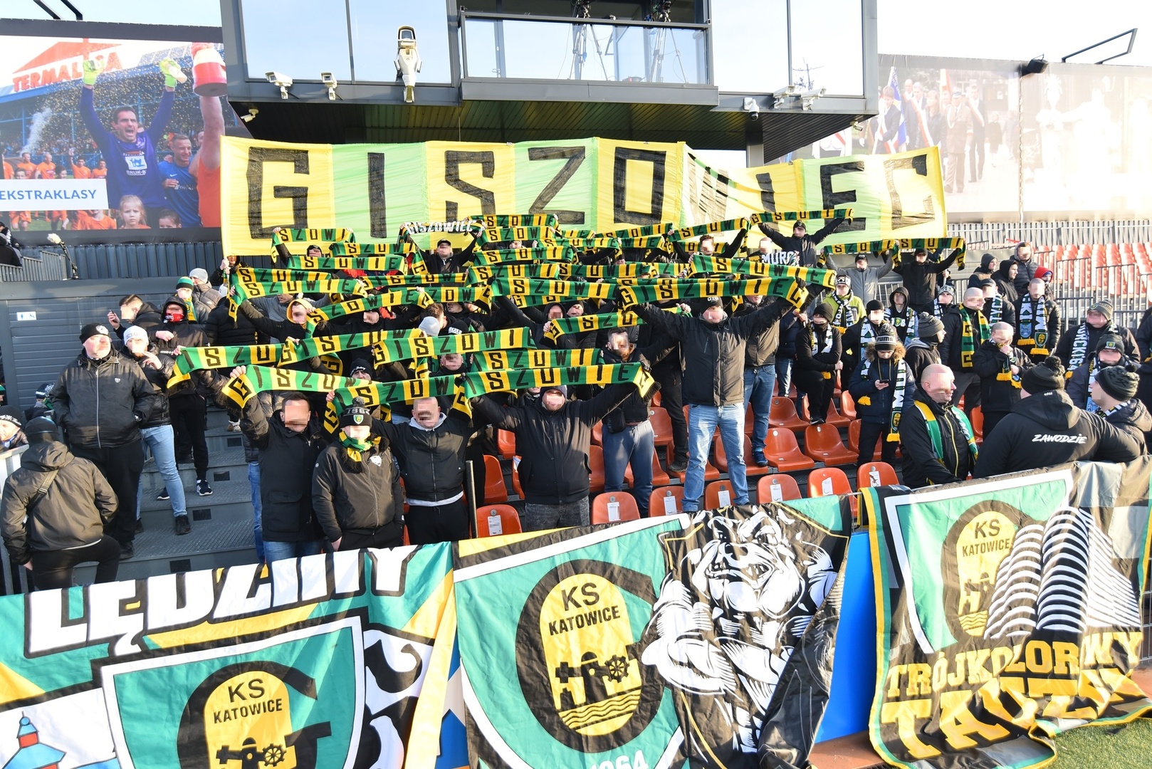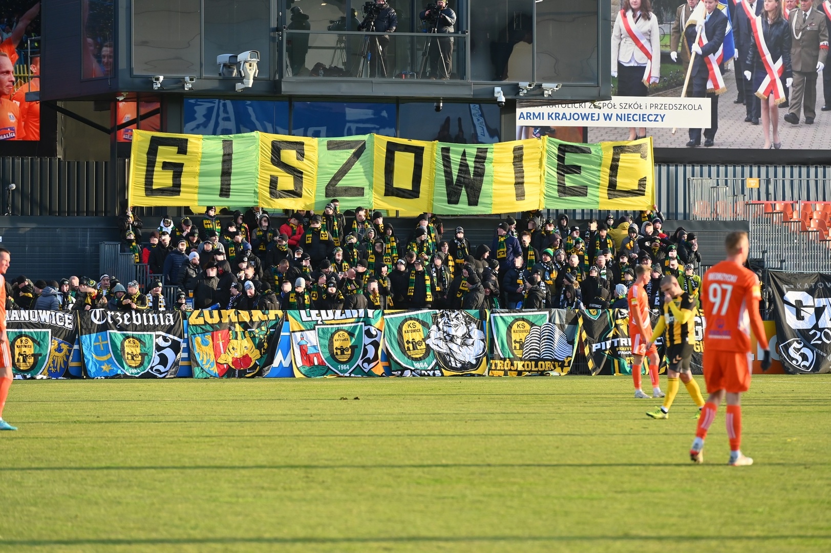 Tego dnia debiutuje flaga „NASZE KATOWICE” (20 m x 2 m), której premiera miała odbyć się jesienią na eskapadzie, gdzie Szczerbowski zablokował nam wyjazd brakiem autoryzacji listy. W sumie tego dnia na wyposażeniu mieliśmy 19 płócien, w tym 3 naszych braci z Ostrawy: ZAKER PLACHEL POZDROWIENIA DO WIĘZIENIA, MAŁOPOLSKA, GENERATION’16 (mała-Banik), WŁADCY MYSŁOWIC (mała), BANIK, ZAKAZOWICZE (Banik), NASZE KATOWICE (debiut), PERSONA NON GRATA (mała), JAWORZNO ON TOUR, WITOSA, SIEMIANOWICE ŚLĄSKIE, TRZEBINIA, ŻORSKA GIEKSA (mała), LĘDZINY & HOŁDUNÓW, BBZ-ZAWODZIE, TAUZEN, PIOTROWICE, GzG’05 i GISZOWIEC. Niestety niski płotek, sprawił, że nie prezentowały się w całej swojej okazałości. Dodatkowo mamy trzy duże flagi na kiju.