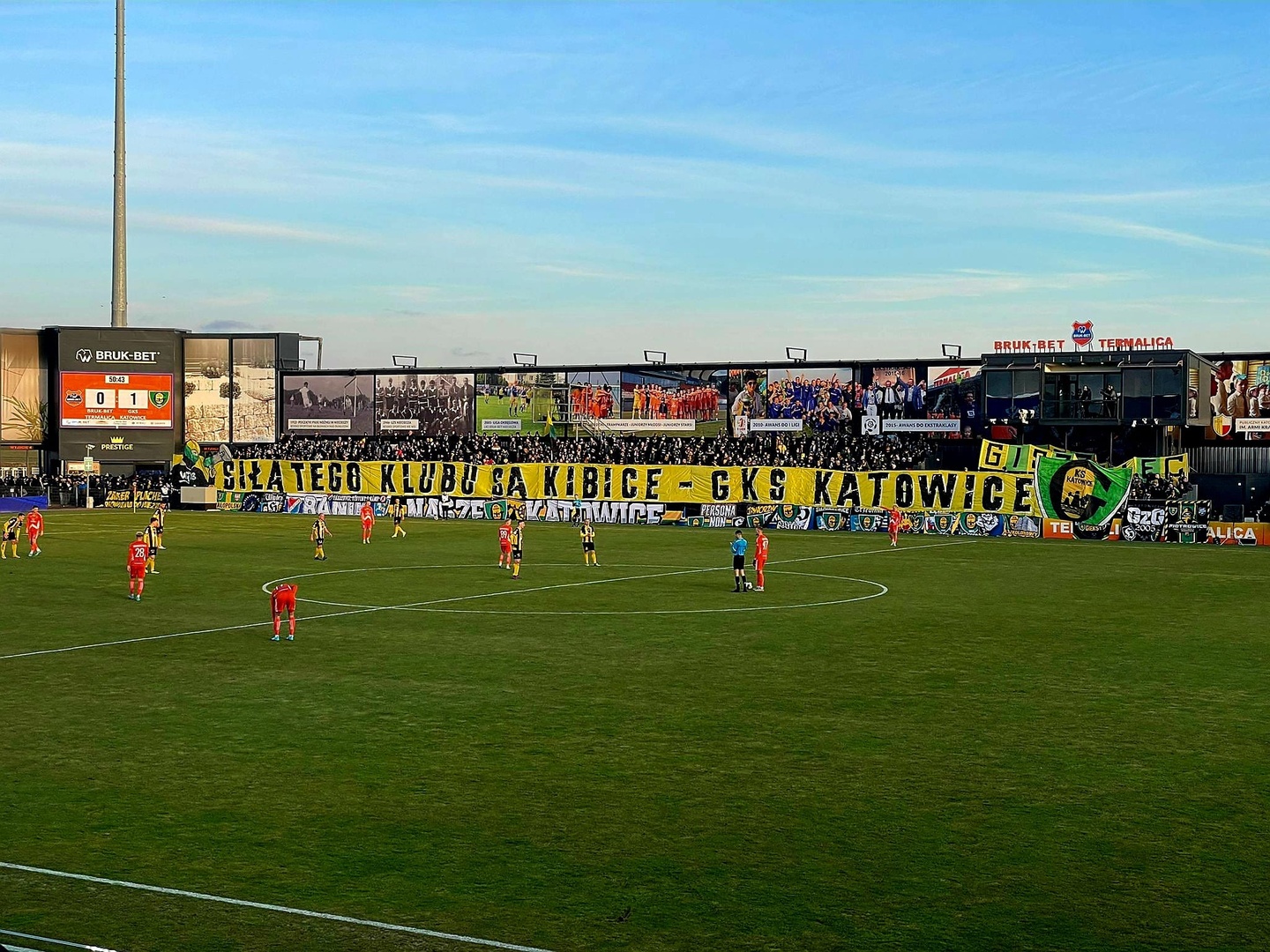 Od samego początku GKS próbował narzucić swój plan na ten mecz i już w pierwszych pięciu minutach dwukrotnie stworzyli sobie okazję lewą stroną boiska. W 12. minucie piłkarze GieKSy zasnęli w obronie, co starali się wykorzystać zawodnicy gospodarzy, na nasze szczęście Kudła popisał się pewną interwencją i złapał piłkę. Chwilę później Mateusz Marzec dostał piłkę na dwudziestym metrze, podprowadził sobie ją kilka metrów i strzałem na dalszy słupek pokonał bramkarza. Dla Marca był to debiut w barwach GieKSy i już wpisał się na listę strzelców. W kolejnej sytuacji ten sam zawodnik posłał tak zwany centrostrzał na bramkę Tomasza Loski, ale ten zdołał wybić go na rzut rożny. W kolejnych minutach Termalica przejęła inicjatywę i zepchnęła GieKSę do defensywy, co dwukrotnie zmroziło krew w żyłach Katowickich kibiców. Warto w tym miejscu zaznaczyć, że zjawiło się ich na wyjeździe ponad 1500 osób. W 26. minucie Marzec przebiegł z piłką przyklejoną do nogi ponad dwadzieścia metrów, po czym wystawił piłkę Arakowi, jednak on uderzył w środek bramki. W drugiej części pierwszej połowy w obu zespołach wkradło się sporo nerwowości i niedokładności, co wpłynęła na bardzo szarpany obraz gry. W doliczonym czasie pierwszej połowy Figiel ładnie dośrodkował z rzutu wolnego, po rykoszecie do piłki doszedł Jędrych, jednak jego strzał był zbyt lekki by zagrozić bramce rywali.