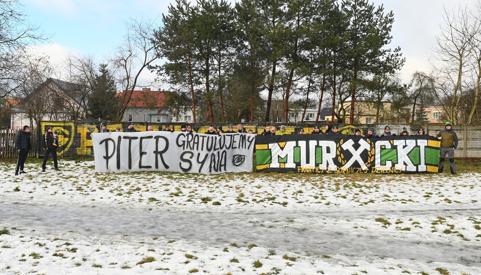 Z tej okazji wydajemy okazjonalne szale z old schoolowym wzorem (134 sztuki), który również wykorzystaliśmy do stworzenia nowego płótna. Dzięki uniwersalnemu rozwiązaniu, nadaje się zarówno na płot, jak i na kije, przez co byliśmy doskonale widoczni przez cały mecz.