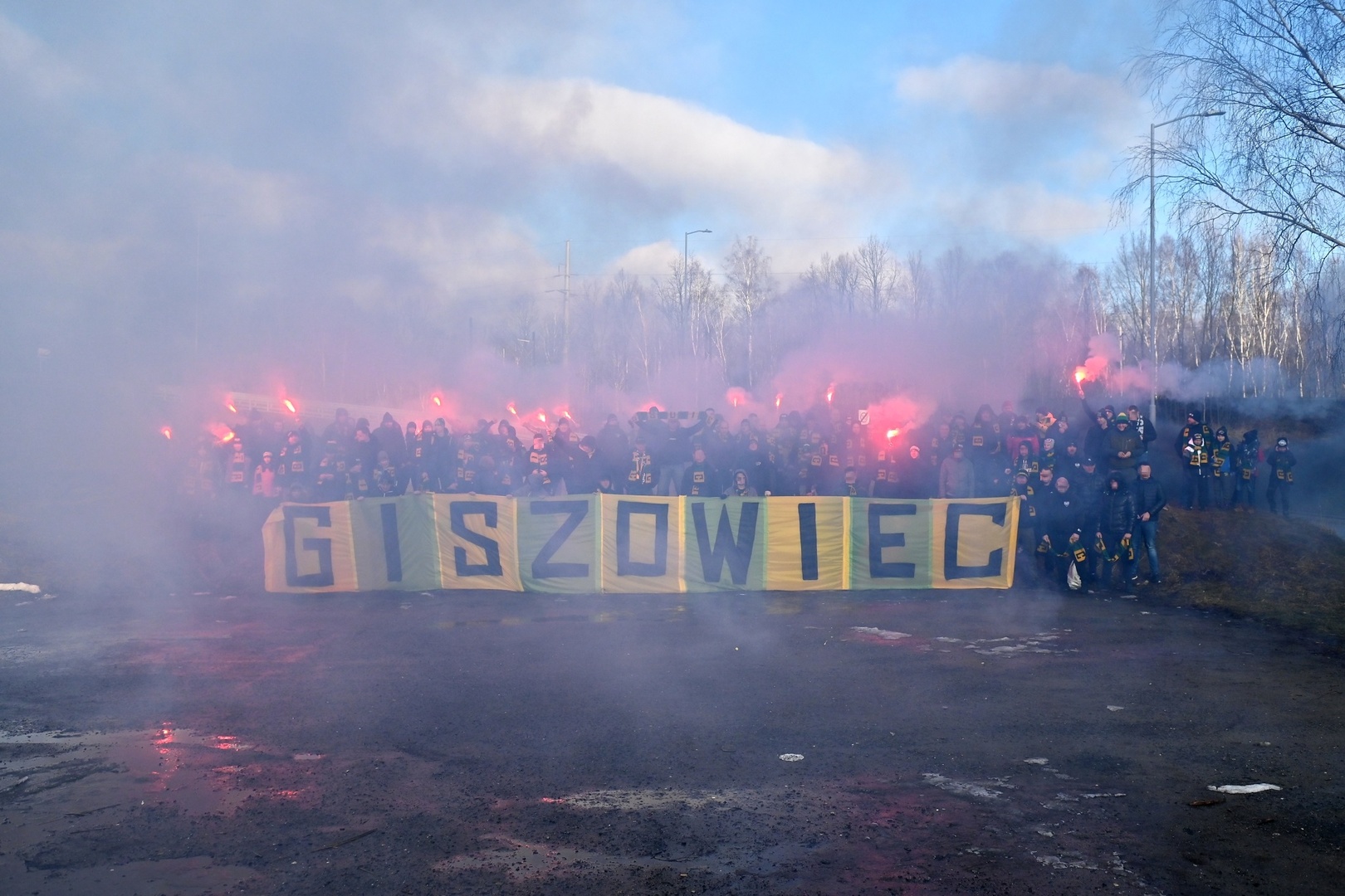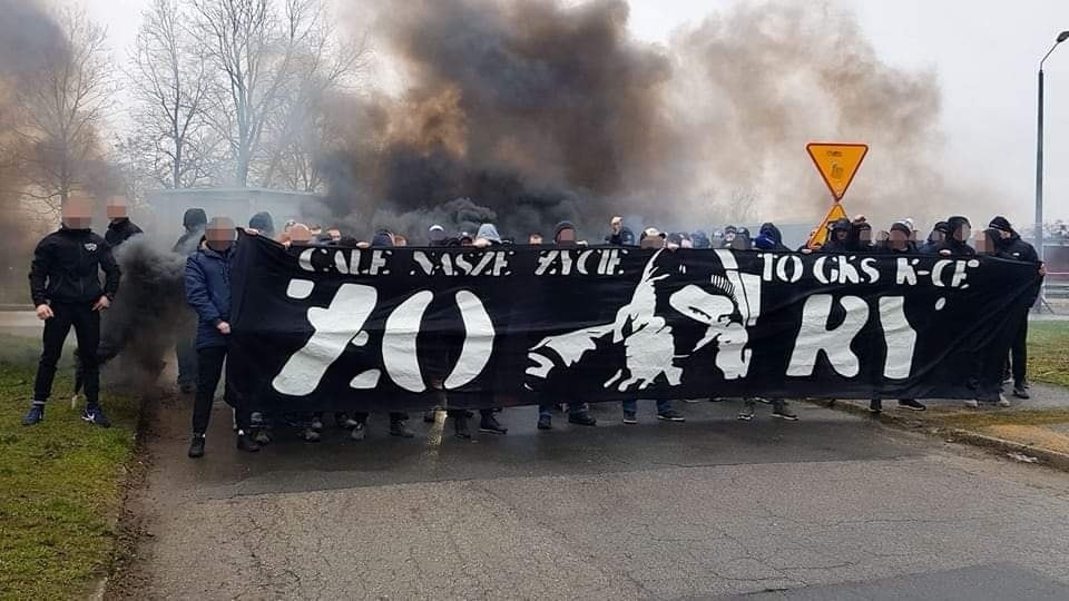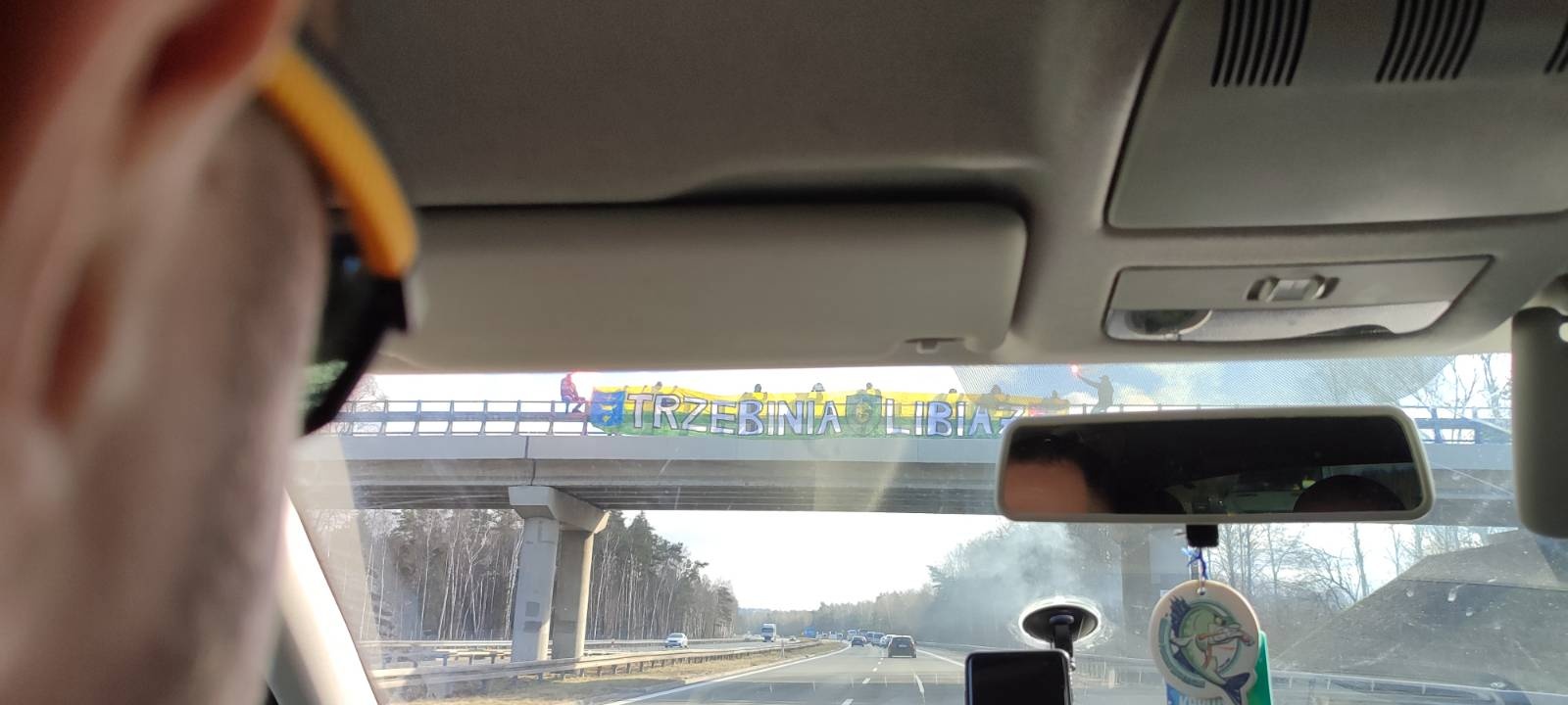 Ostatecznie przed godzinną 11:00 wyruszyliśmy w 1261 głów, w tym 39 Banik oraz gościnnie 4 Spartak Trnava i 3 Siarka Tarnobrzeg – dzięki! Po wjechaniu do województwa małopolskiego na jednym z wiaduktów powitał nas transparent „TRZEBINIA & LIBIĄŻ” w najpiękniejszych barwach, przy asyście rac morskich. Była to niespodzianka dla wyjazdowiczów, zorganizowana przez tamtejsze fan cluby.