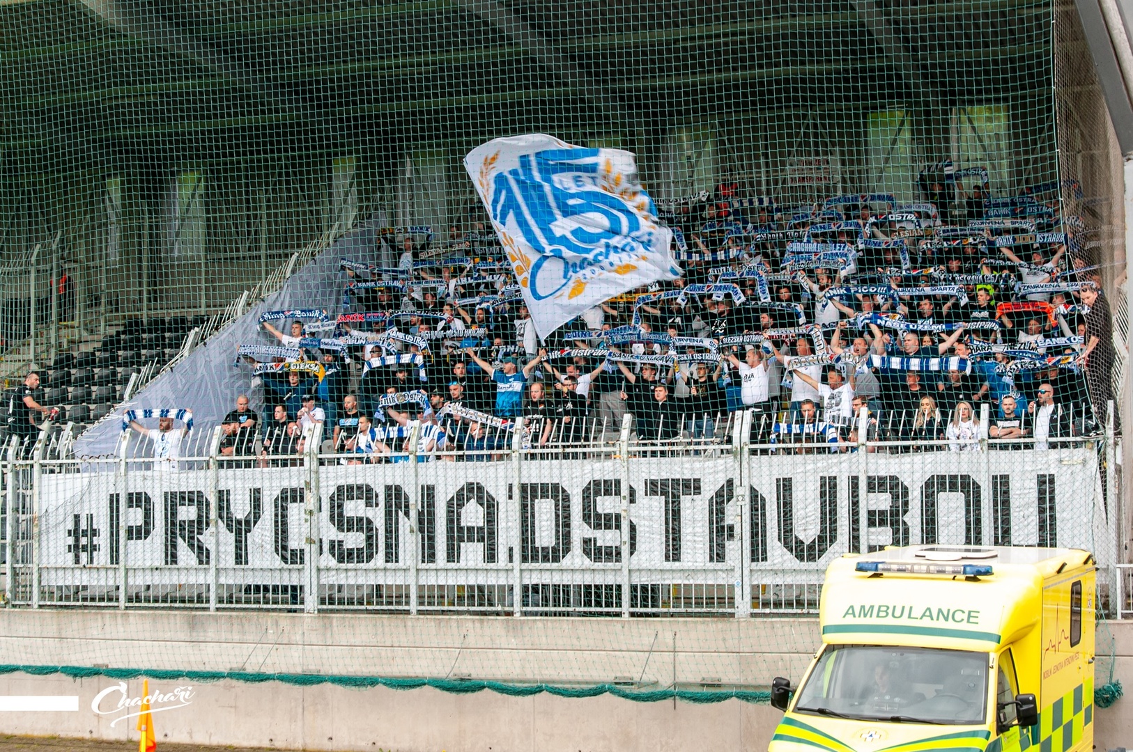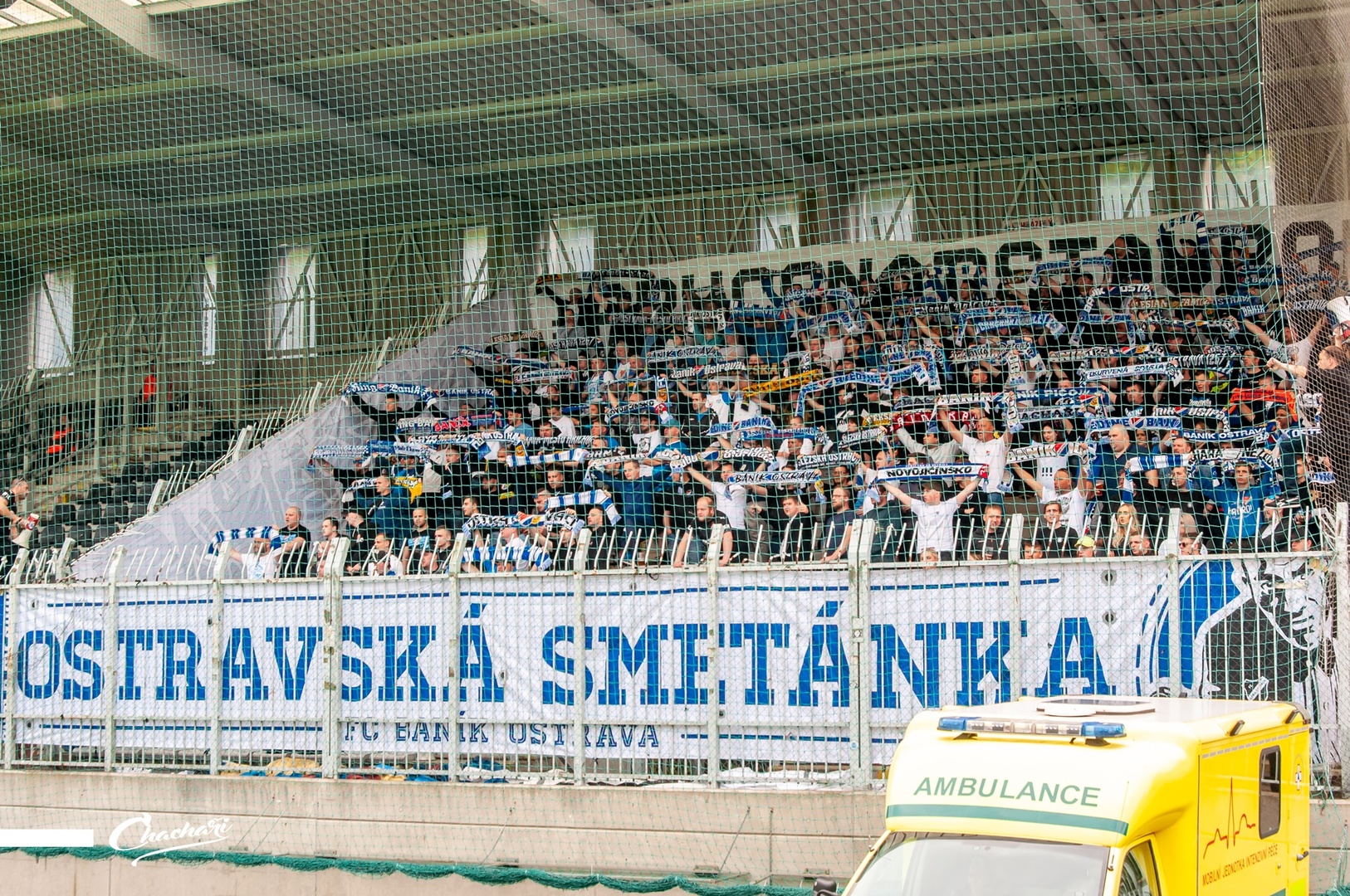 Na początku meczu nasz doping utrzymywał przyzwoite standardy. Hymn i początkowy okrzyk „Baník Ostrava” niosły się po stadionie bardzo dobrze. Potem wszystko popadło w taką przeciętną szarość z małymi głośniejszymi momentami. Swoją premierę miała także nowa przyśpiewka „Ostravský Baník do boje”. Na wyposażeniu mamy dużą machajkę Chachari z okazji 15. rocznicy oraz trzy małe, pomalowane na niebiesko i biało, którymi machamy przez całe spotkanie.