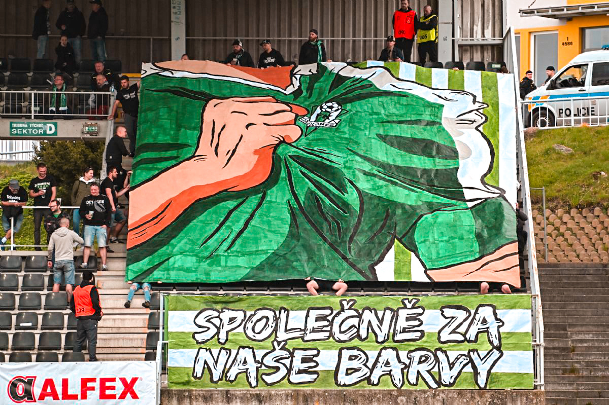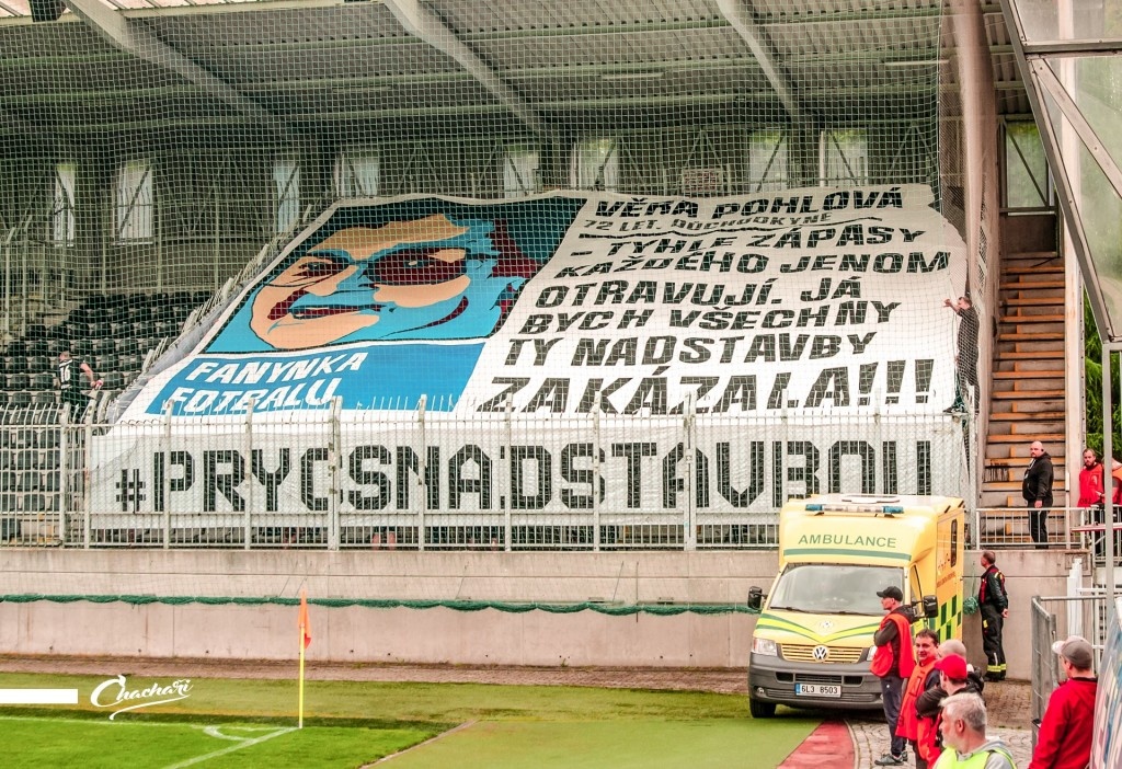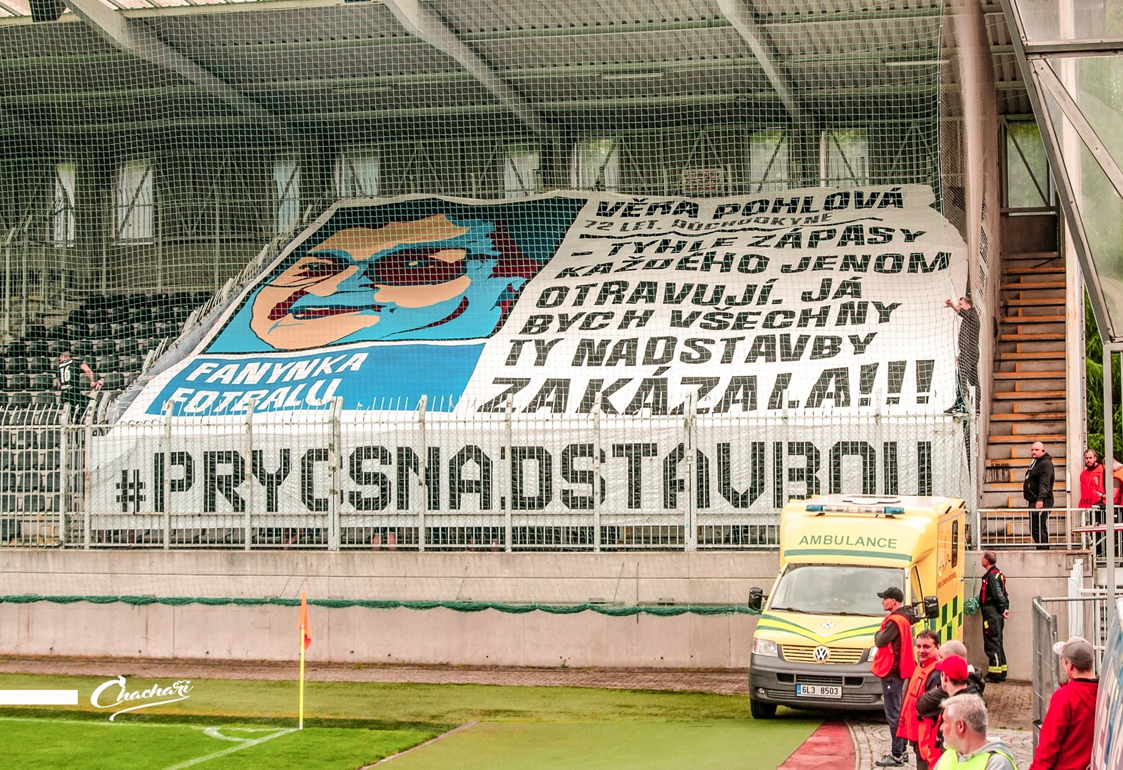 Na meczu były oprawy z obu stron. Z Ostrawy po raz pierwszy w historii przywieźliśmy do Jablonca sektorówkę wielkości całej klatki. Mimo doświadczeń z przeszłości nie było problemu z wniesieniem jej. Nad głowami Chacharów powiewała sektorówka z legendą czeskich sondaży, Věrą Pohlovą. Ta 72-letnia emerytka, która jest fanką piłki nożnej, została zapytana przez dziennikarzy o jej zdanie na temat formatu ligi z nadbudową (play-off). W odpowiedzi można było przeczytać: „Te mecze po prostu irytują każdego. Zakazałbym wszystkich tych nadbudów!!!” A ponieważ pani Pohlová idzie z duchem czasu, przygotowała również hashtag „#prycsnadstavbou” na banerze. Mam nadzieję, że ten hashtag będzie często pojawiał się w sieciach społecznościowych 🙂