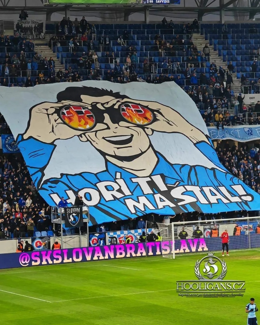 Kibice Slovanu wystawili niespełna tysięczny młyn, choć ogólnie na meczu ligowym na stadionie Narodowym Słowacji, zjawiło się ponad 11 tysięcy widzów. Razem z nimi delegacja z Krakowa i Chorzowa. Błękitni, na początku meczu prezentują oprawę, stylizowaną i nawiązującą do ostatniej choreografii Spartaka, podczas ostatnich derbów w Trnawie. Wtedy kibice FCST palili zdobyczną flagę Slovanistów i przez wypadek ogień doszedł także do przygotowanych na następna oprawę fajerwerek, powodując popłoch wśród fanów. Oprawa to sektorówka przedstawiająca kibica Slovanu patrzącego przez lornetkę, jak się pali sektor czerwono-czarny, z uzupełniającym napisem „Twoja stodoła pali się”. Następnie odpalono 600 stroboskopów.