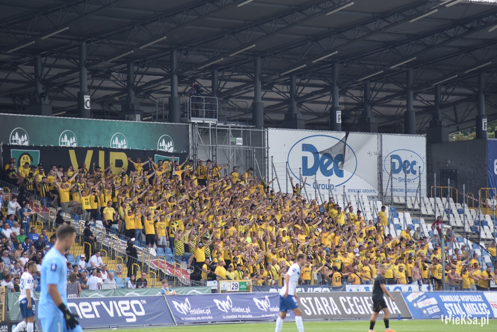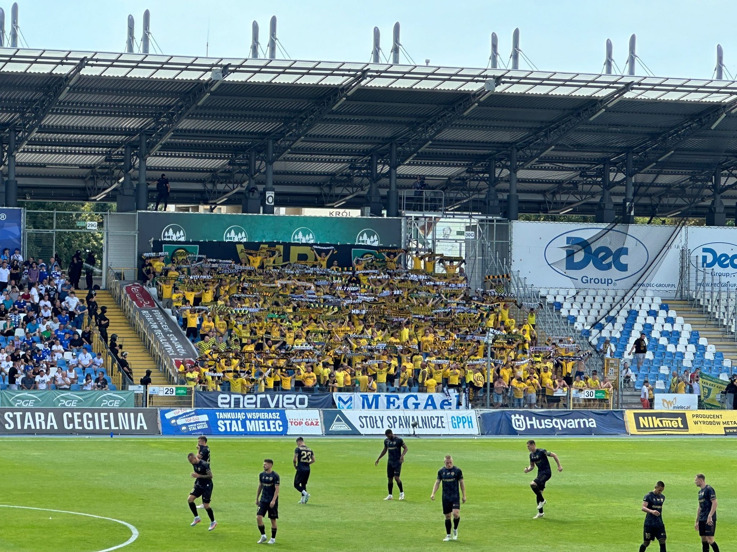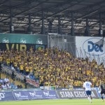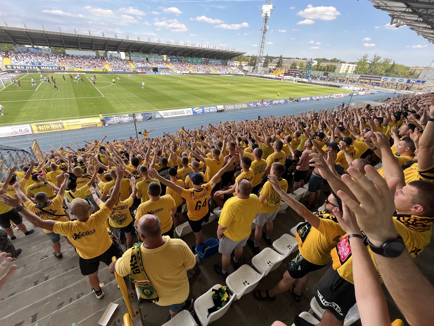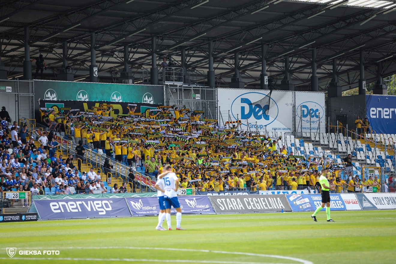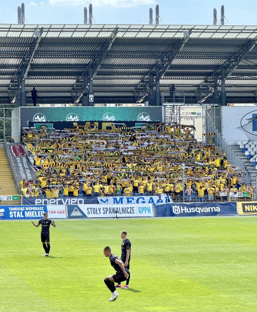 Na początek głośno dziękujemy gospodarzom za możliwość obejrzenia pierwszego wyjazdowego spotkania naszej drużyny po powrocie do Ekstraklasy, a następnie jedziemy już z wokalem dla naszej jedenastki. Z naszej perspektywy młyn FKS-u, który był naprzeciw, niesłyszalny wcale. Ogólnie ciężko mieli się przebić przez nakręconą decybelami „żółtą ścianę”. Ta sztuka udała im się jedynie gdy włączały się inne sektory. Na wyposażeniu mieli flagę „FKS STAL MIELEC”, do której w drugiej połowie dołączyło płótno „ŚP. KOREK”.